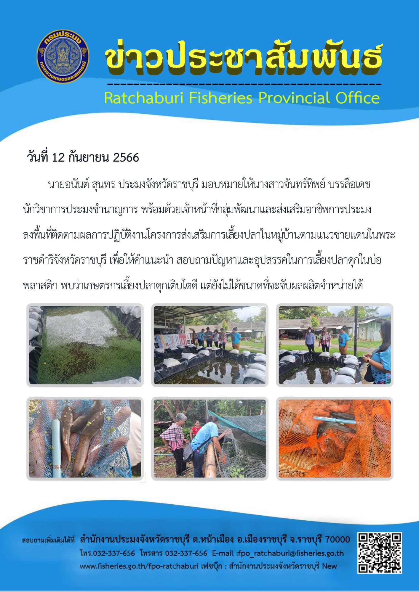 วันที่ 12 กันยายน 2566 นายอนันต์ สุนทร ประมงจังหวัดราชบุรี มอบหมายให้ นางสาวจันทร์ทิพย์ บรรลือเดช นักวิชาการประมงชำนาญการ พร้อมด้วยเจ้าหน้าที่กลุ่มพัฒนาและส่งเสริมอาชีพการประมง ลงพื้นที่ติดตามผลการปฏิบัติงานโครงการส่งเสริมการเลี้ยงปลาในหมู่บ้านตามแนวชายแดนในพระราชดำริจังหวัดราชบุรี เพื่อให้คำแนะนำ สอบถามปัญหาและอุปสรรคในการเลี้ยงปลาดุกในบ่อพลาสติก พบว่าเกษตรกรเลี้ยงปลาดุกเติบโตดี แต่ยังไม่ได้ขนาดที่จะจับผลผลิตจำหน่ายได้