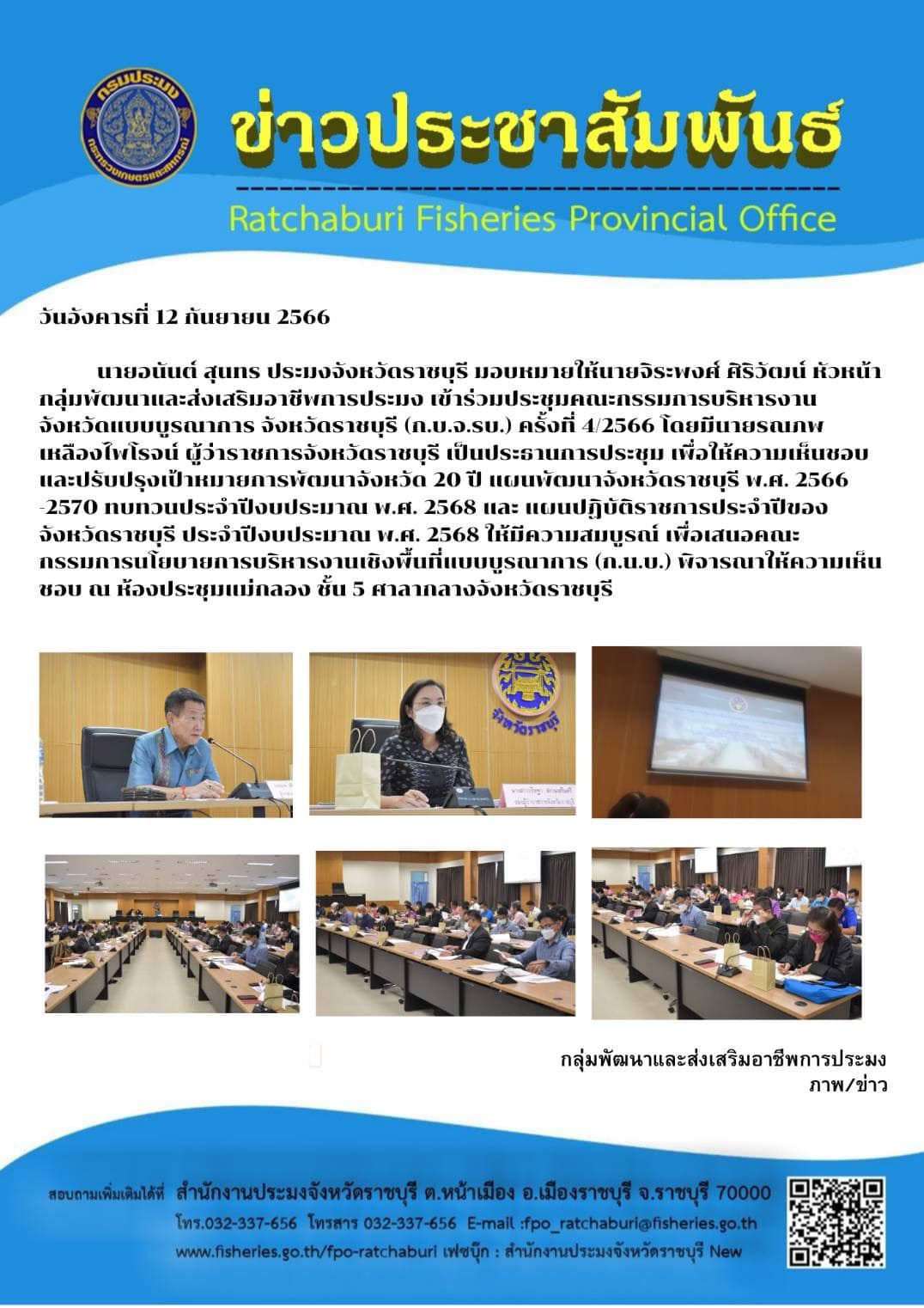 วันอังคารที่ 12 กันยายน 2566 นายอนันต์ สุนทร ประมงจังหวัดราชบุรี มอบหมายให้ นายจิระพงศ์ ศิริวัฒน์ หัวหน้ากลุ่มพัฒนาและส่งเสริมอาชีพการประมง เข้าร่วมประชุมคณะกรรมการบริหารงานจังหวัดแบบบูรณาการ จังหวัดราชบุรี (ก.บ.จ.รบ.) ครั้งที่ 4/2566 โดยมี นายรณภพ เหลืองไพโรจน์ ผู้ว่าราชการจังหวัดราชบุรี เป็นประธานการประชุม เพื่อให้ความเห็นชอบและปรับปรุงเป้าหมายการพัฒนาจังหวัด 20 ปี แผนพัฒนาจังหวัดราชบุรี พ.ศ. 2566 -2570 ทบทวนประจำปีงบประมาณ พ.ศ. 2568 และ แผนปฏิบัติราชการประจำปีของจังหวัดราชบุรี ประจำปีงบประมาณ พ.ศ. 2568 ให้มีความสมบูรณ์ เพื่อเสนอคณะกรรมการนโยบายการบริหารงานเชิงพื้นที่แบบบูรณาการ (ก.น.บ.) พิจารณาให้ความเห็นชอบ ณ ห้องประชุมแม่กลอง ชั้น 5 ศาลากลางจังหวัดราชบุรี
