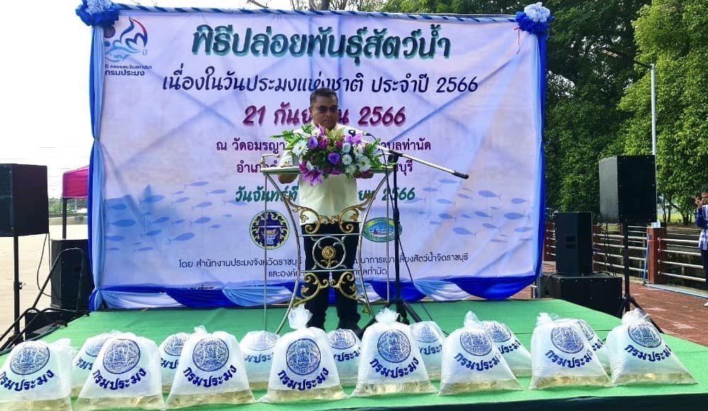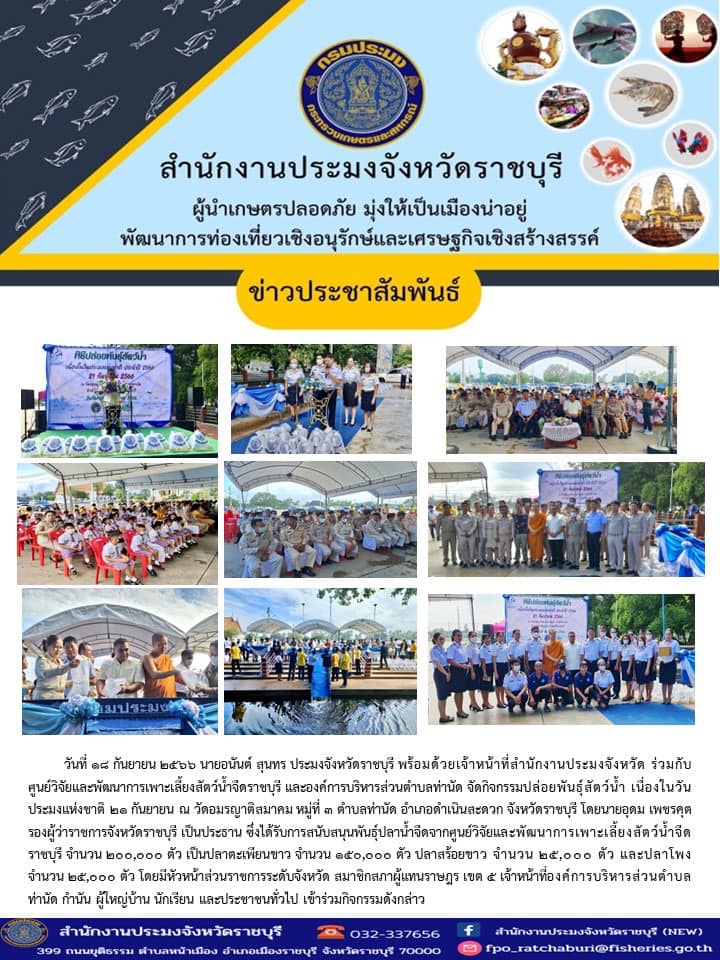 วันที่ 18 กันยายน 2566 นายอนันต์ สุนทร ประมงจังหวัดราชบุรี พร้อมด้วย เจ้าหน้าที่สำนักงานประมงจังหวัด ร่วมกับ ศูนย์วิจัยและพัฒนาการเพาะเลี้ยงสัตว์น้ำจืดราชบุรี และองค์การบริหารส่วนตำบลท่านัด จัดกิจกรรมปล่อยพันธุ์สัตว์น้ำ เนื่องในวันประมงแห่งชาติ 21 กันยายน ในวันจันทร์ที่ 18 กันยายน 2566 ณ วัดอมรญาติสมาคม หมู่ที่ 3 ตำบลท่านัด อำเภอดำเนินสะดวก จังหวัดราชบุรี โดย นายอุดม เพชรคุต รองผู้ว่าราชการจังหวัดราชบุรี เป็นประธาน ซึ่งได้รับการสนับสนุนพันธุ์ปลาน้ำจืดจากศูนย์วิจัยและพัฒนาการเพาะเลี้ยงสัตว์น้ำจืดราชบุรี จำนวน 200,000 ตัว เป็นปลาตะเพียนขาว จำนวน 150,000 ตัว ปลาสร้อยขาว จำนวน 25,000 ตัว และปลาโพง จำนวน 25,000 ตัว โดยมีหัวหน้าส่วนราชการระดับจังหวัด สมาชิกสภาผู้แทนราษฎร เขต 5 เจ้าหน้าที่องค์การบริหารส่วนตำบลท่านัด กำนัน ผู้ใหญ่บ้าน นักเรียน และประชาชนทั่วไป เข้าร่วมกิจกรรมดังกล่าว
