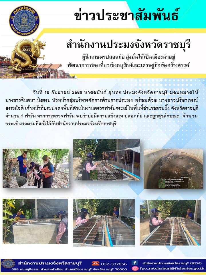 วันที่ 19 กันยายน 2566 นายอนันต์ สุนทร ประมงจังหวัดราชบุรี มอบหมายให้ นางสาวจินตนา นิธรรม หัวหน้ากลุ่มบริหารจัดการด้านการประมง พร้อมด้วย นางสาวปรียาภรณ์ ธรรมโชติ เจ้าหน้าที่ประมง ลงพื้นที่ดำเนินงานตรวจฟาร์มจระเข้ ในพื้นที่อำเภอสวนผึ้ง จังหวัดราชบุรี จำนวน 1 ฟาร์ม จากการตรวจฟาร์ม พบว่าบ่อมีความแข็งแรง ปลอดภัย และถูกสุขลักษณะ จำนวนจระเข้ ตรงตามที่แจ้งไว้กับสำนักงานประมงจังหวัดราชบุรี