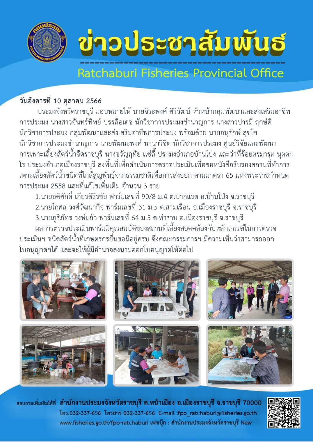 วันที่ 10 ตุลาคม 2566 ประมงจังหวัดราชบุรี มอบหมายให้ นายจิระพงศ์ ศิริวัฒน์ หัวหน้ากลุ่มพัฒนาและส่งเสริมอาชีพการประมง นางสาวจันทร์ทิพย์ บรรลือเดช นักวิชาการประมงชำนาญการ นางสาวปารมี ฤกษ์ดี นักวิชาการประมง กลุ่มพัฒนาและส่งเสริมอาชีพการประมง พร้อมด้วย นายอนุรักษ์ สุขโข นักวิชาการประมงชำนาญการ นายพัฒนะพงศ์ นานาวิชิต นักวิชาการประมง ศูนย์วิจัยและพัฒนาการเพาะเลี้ยงสัตว์น้ำจืดราชบุรี นางขวัญฤทัย เเซ่ลี้ ประมงอำเภอบ้านโป่ง และว่าที่ร้อยตรีมารุต นุตตะโร ประมงอำเภอเมืองราชบุรี ลงพื้นที่เพื่อดำเนินการตรวจประเมินเพื่อขอหนังสือรับรองสถานที่ทำการเพาะเลี้ยงสัตว์น้ำชนิดที่ใกล้สูญพันธุ์จากธรรมชาติเพื่อการส่งออก ตามมาตรา 65 แห่งพระราชกำหนดการประมง 2558 และที่แก้ไขเพิ่มเติม จำนวน 3 ราย