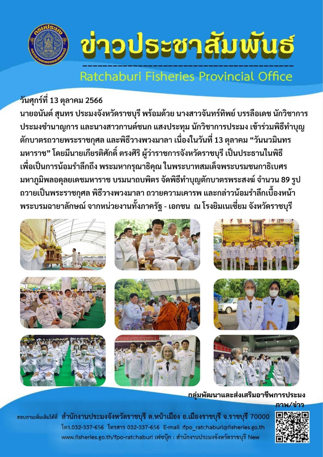 วันศุกร์ที่ 13 ตุลาคม 2566 นายอนันต์ สุนทร ประมงจังหวัดราชบุรี พร้อมด้วย นางสาวจันทร์ทิพย์ บรรลือเดช นักวิชาการประมงชำนาญการ และนางสาวกานต์ชนก แสงประทุม นักวิชาการประมง เข้าร่วมพิธีทำบุญตักบาตรถวายพระราชกุศล และพิธีวางพวงมาลา เนื่องในวันที่ 13 ตุลาคม “วันนวมินทรมหาราช” โดยมีนายเกียรติศักดิ์ ตรงศิริ ผู้ว่าราชการจังหวัดราชบุรี เป็นประธานในพิธี เพื่อเป็นการน้อมรำลึกถึง พระมหากรุณาธิคุณ ในพระบาทสมเด็จพระบรมชนกาธิเบศร มหาภูมิพลอดุลยเดชมหาราช บรมนาถบพิตร จัดพิธีทำบุญตักบาตรพระสงฆ์ จำนวน 89 รูป ถวายเป็นพระราชกุศล พิธีวางพวงมาลา ถวายความเคารพ และกล่าวน้อมรำลึกเบื้องหน้าพระบรมฉายาลักษณ์ จากหน่วยงานทั้งภาครัฐ - เอกชน ณ โรงยิมเนเซี่ยม จังหวัดราชบุรี