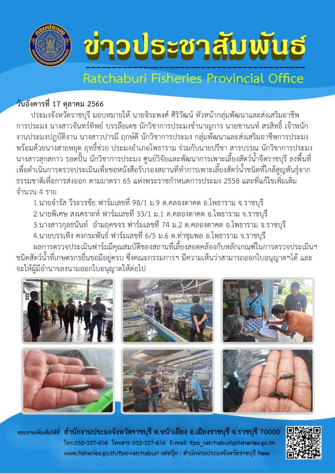 วันอังคารที่ 17 ตุลาคม 2566 ประมงจังหวัดราชบุรี มอบหมายให้ นายจิระพงศ์ ศิริวัฒน์ หัวหน้ากลุ่มพัฒนาและส่งเสริมอาชีพการประมง นางสาวจันทร์?ทิพย์? บรรลือเดช? นักวิชาการ?ประมง?ชำนาญการ? นายชานนท์ สรสิทธิ์ เจ้าพนักงานประมงปฏิบัติงาน นางสาวปารมี ฤกษ์ดี นักวิชาการประมง กลุ่มพัฒนาและส่งเสริมอาชีพการประมง พร้อมด้วย นางสายหยุด ฤทธิ์ช่วย ประมงอำเภอโพธาราม ร่วมกับ นายปรีชา สารบรรณ นักวิชาการประมง? นางสาวสุกสกาว รอดปั้น นักวิชาการประมง ศูนย์?วิจัยและ?พัฒนา?การ?เพาะเลี้ยง?สัตว์?น้ำจืดราชบุรี? ลงพื้นที่เพื่อดำเนินการตรวจประเมินเพื่อขอหนังสือรับรองสถานที่ทำการเพาะเลี้ยงสัตว์น้ำชนิดที่ใกล้สูญพันธุ์จากธรรมชาติเพื่อการส่งออก ตามมาตรา 65 แห่งพระราชกำหนดการประมง 2558 และที่แก้ไขเพิ่มเติม จำนวน 4 ราย?