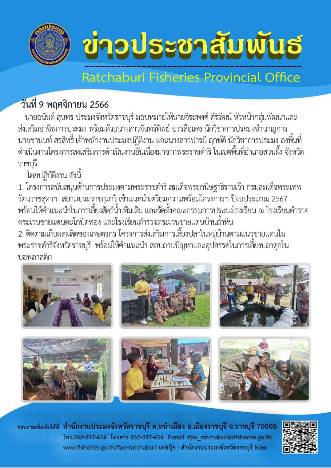 วันพฤหัสบดีที่ 9 พฤศจิกายน 2566 นายอนันต์ สุนทร ประมงจังหวัดราชบุรี มอบหมายให้ นายจิระพงศ์ ศิริวัฒน์ หัวหน้ากลุ่มพัฒนาและส่งเสริมอาชีพการประมง พร้อมด้วย นางสาวจันทร์ทิพย์ บรรลือเดช นักวิชาการประมงชำนาญการ นายชานนท์ สรสิทธิ์ เจ้าพนักงานประมงปฏิบัติงาน และนางสาวปารมี ฤกษ์ดี นักวิชาการประมง ลงพื้นที่ดำเนินงานโครงการส่งเสริมการดำเนินงานอันเนื่องมาจากพระราชดำริ ในเขตพื้นที่อำเภอสวนผึ้ง จังหวัดราชบุรี โดยปฏิบัติงาน ดังนี้