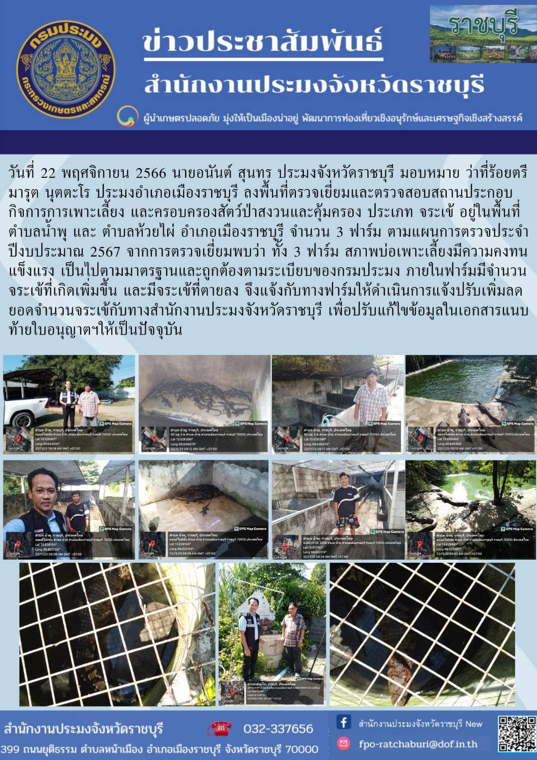 วันที่ 22 พฤศจิกายน 2566 นายอนันต์ สุนทร ประมงจังหวัดราชบุรี มอบหมายให้ ว่าที่ร้อยตรี มารุต นุตตะโร ประมงอำเภอเมืองราชบุรี ลงพื้นที่ตรวจเยี่ยมและตรวจสอบสถานประกอบกิจการการเพาะเลี้ยง และครอบครองสัตว์ป่าสงวนและคุ้มครอง ประเภท จระเข้ อยู่ในพื้นที่ตำบลน้ำพุ และ ตำบลห้วยไผ่ อำเภอเมืองราชบุรี จำนวน 3 ฟาร์ม ตามแผนการตรวจประจำปีงบประมาณ 2567