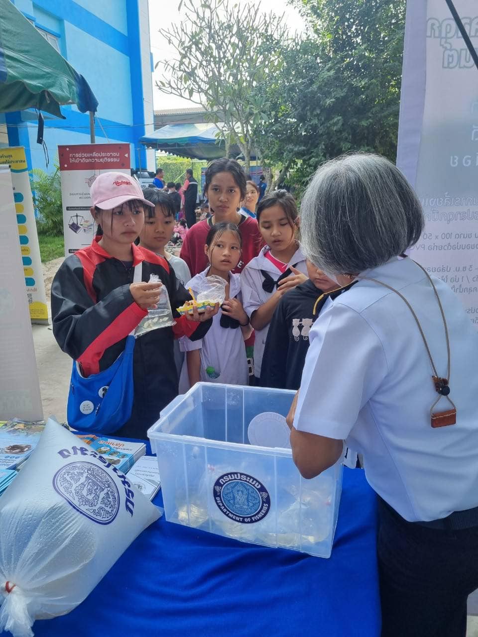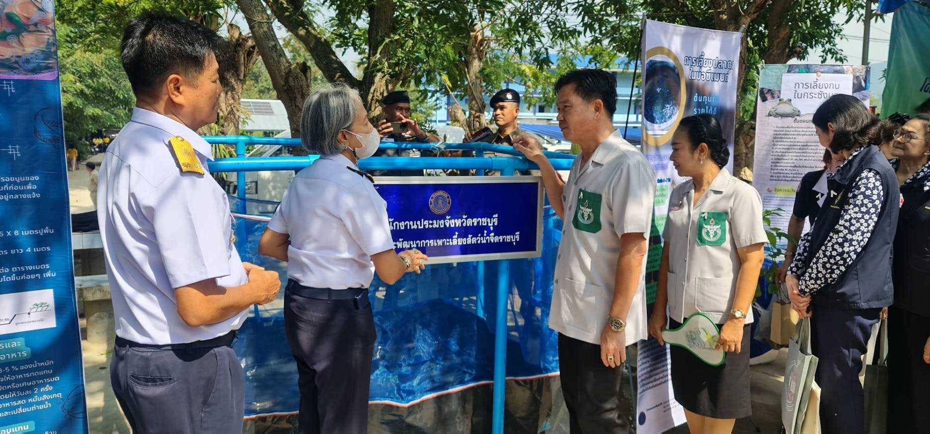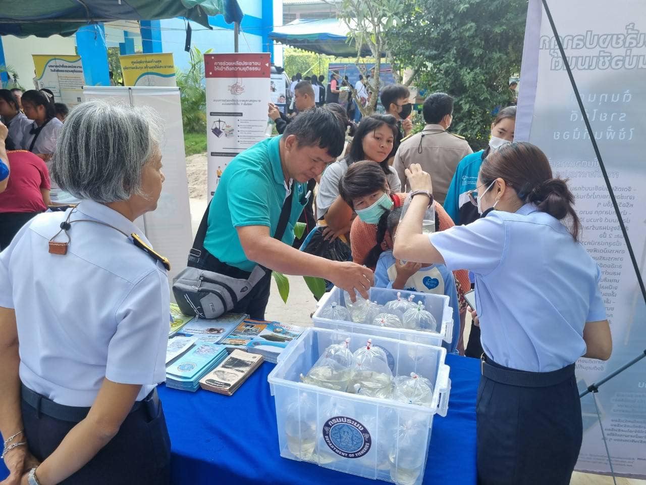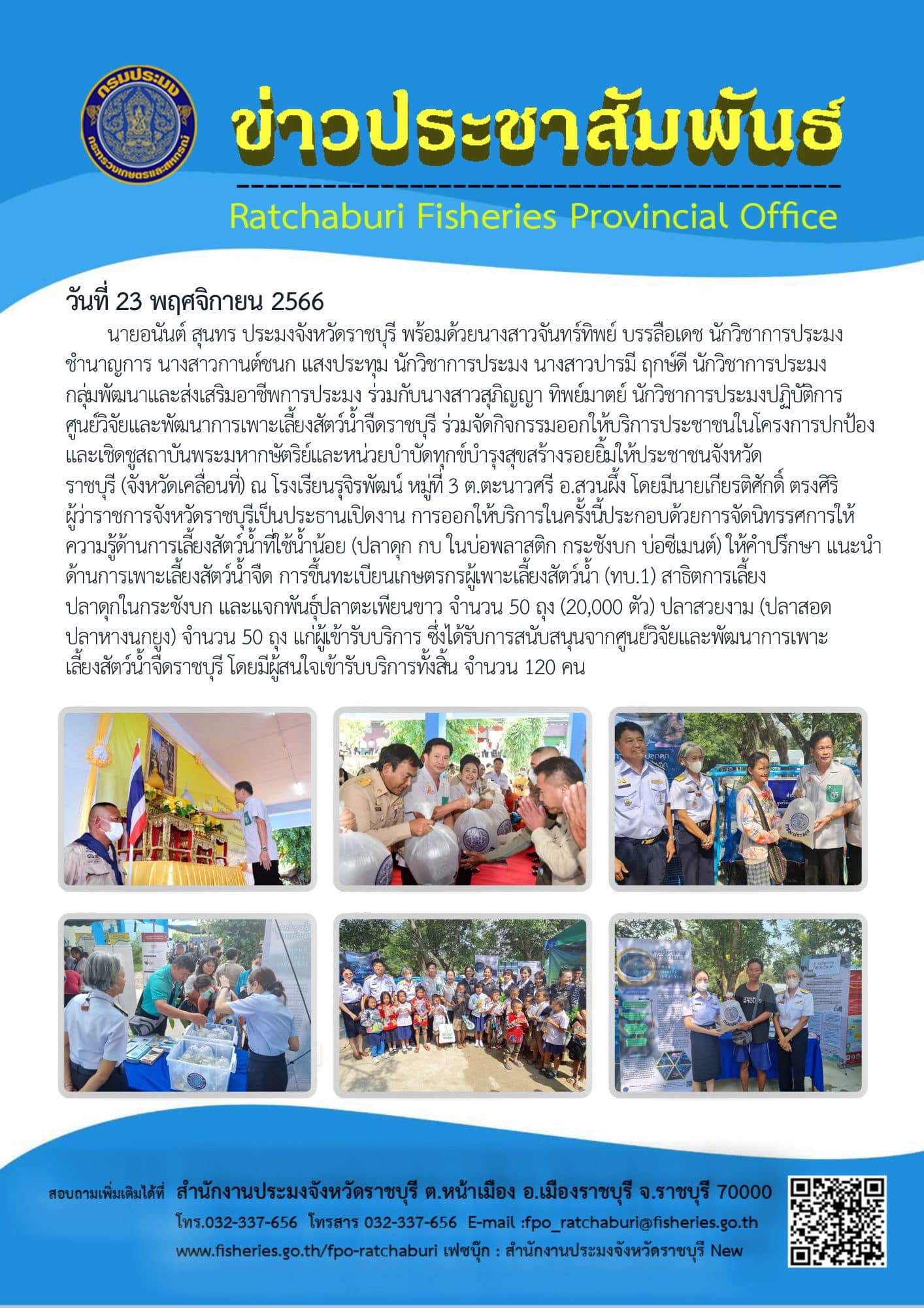 วันที่ 23 พฤศจิกายน 2566 นายอนันต์ สุนทร ประมงจังหวัดราชบุรี พร้อมด้วยนางสาวจันทร์ทิพย์ บรรลือเดช นักวิชาการประมงชำนาญการ นางสาวกานต์ชนก แสงประทุม นักวิชาการประมง นางสาวปารมี ฤกษ์ดี นักวิชาการประมง กลุ่มพัฒนาและส่งเสริมอาชีพการประมง ร่วมกับ นางสาวสุภิญญา ทิพย์มาตย์ นักวิชาการประมงปฏิบัติการ ศูนย์วิจัยและพัฒนาการเพาะเลี้ยงสัตว์น้ำจืดราชบุรี ร่วมจัดกิจกรรมออกให้บริการประชาชนในโครงการปกป้องและเชิดชูสถาบันพระมหากษัตริย์และหน่วยบำบัดทุกข์บำรุงสุขสร้างรอยยิ้มให้ประชาชนจังหวัดราชบุรี (จังหวัดเคลื่อนที่) ณ โรงเรียนรุจิระพัฒน์ หมู่ที่ 3 ต.ตะนาวศรี อ.สวนผึ้ง โดยมีนายเกียรติศักดิ์ ตรงศิริ ผู้ว่าราชการจังหวัดราชบุรีเป็นประธานเปิดงาน การออกให้บริการในครั้งนี้ประกอบด้วยการจัดนิทรรศการให้ความรู้ด้านการเลี้ยงสัตว์น้ำที่ใช้น้ำน้อย (ปลาดุก กบ ในบ่อพลาสติก กระชังบก บ่อซีเมนต์) ให้คำปรึกษา แนะนำ ด้านการเพาะเลี้ยงสัตว์น้ำจืด การขึ้นทะเบียนเกษตรกรผู้เพาะเลี้ยงสัตว์น้ำ (ทบ.1) สาธิตการเลี้ยงปลาดุกในกระชังบก และแจกพันธุ์ปลาตะเพียนขาว จำนวน 50 ถุง (20,000 ตัว) ปลาสวยงาม (ปลาสอด ปลาหางนกยูง) จำนวน 50 ถุง แก่ผู้เข้ารับบริการ ซึ่งได้รับการสนับสนุนจากศูนย์วิจัยและพัฒนาการเพาะเลี้ยงสัตว์น้ำจืดราชบุรี โดยมีผู้สนใจเข้ารับบริการทั้งสิ้น จำนวน 120 คน