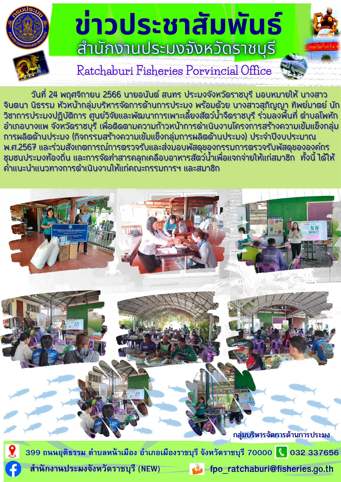 วันที่ 24 พฤศจิกายน 2566 นายอนันต์ สนทร ประมงจังหวัดราชบุรี มอบหมายให้ นางสาวจินตนา นิธรรม หัวหน้ากลุ่มบริหารจัดการด้านการประมง พร้อมด้วย นางสาวสุภิญญา ทิพย์มาตย์ นักวิชาการประมงปฏิบัติการ ศูนย์วิจัยและพัฒนาการเพาะเลี้ยงสัตว์น้ำจืดราชบุรี ร่วมลงพื้นที่ ตำบลโพหัก อำเภอบางแพ จังหวัดราชบุรี เพื่อติดตามความก้าวหน้าการดำเนินงานโครงการสร้างความเข้มแข็งกลุ่มการผลิตด้านประมง (กิจกรรมสร้างความเข้มแข็งกลุ่มการผลิตด้านประมง) ประจำปีงบประมาณ พ.ศ.2567 และร่วมสังเกตการณ์การตรวจรับและส่งมอบพัสดุของกรรมการตรวจรับพัสดุขององค์กรชุมชนประมงท้องถิ่น และการจัดทำสารคลุกเคลือบอาหารสัตว์น้ำเพื่อแจกจ่ายให้แก่สมาชิก ทั้งนี้ ได้ให้คำแนะนำแนวทางการดำเนินงานให้แก่คณะกรรมการฯ และสมาชิก