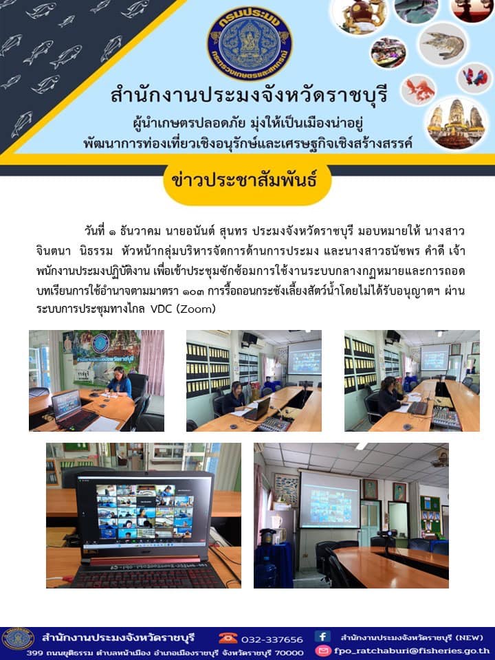วันที่ 1 ธันวาคม 2566 นายอนันต์ สุนทร ประมงจังหวัดราชบุรี มอบหมายให้ นางสาวจินตนา นิธรรม หัวหน้ากลุ่มบริหารจัดการด้านการประมง และนางสาวธนัชพร คำดี เจ้าพนักงานประมงปฏิบัติงาน เข้าประชุมซักซ้อมการใช้งานระบบกลางกฏหมายและการถอดบทเรียนการใช้อำนาจตามมาตรา 103 การรื้อถอนกระชังเลี้ยงสัตว์น้ำโดยไม่ได้รับอนุญาตฯ ผ่านระบบการประชุมทางไกล
