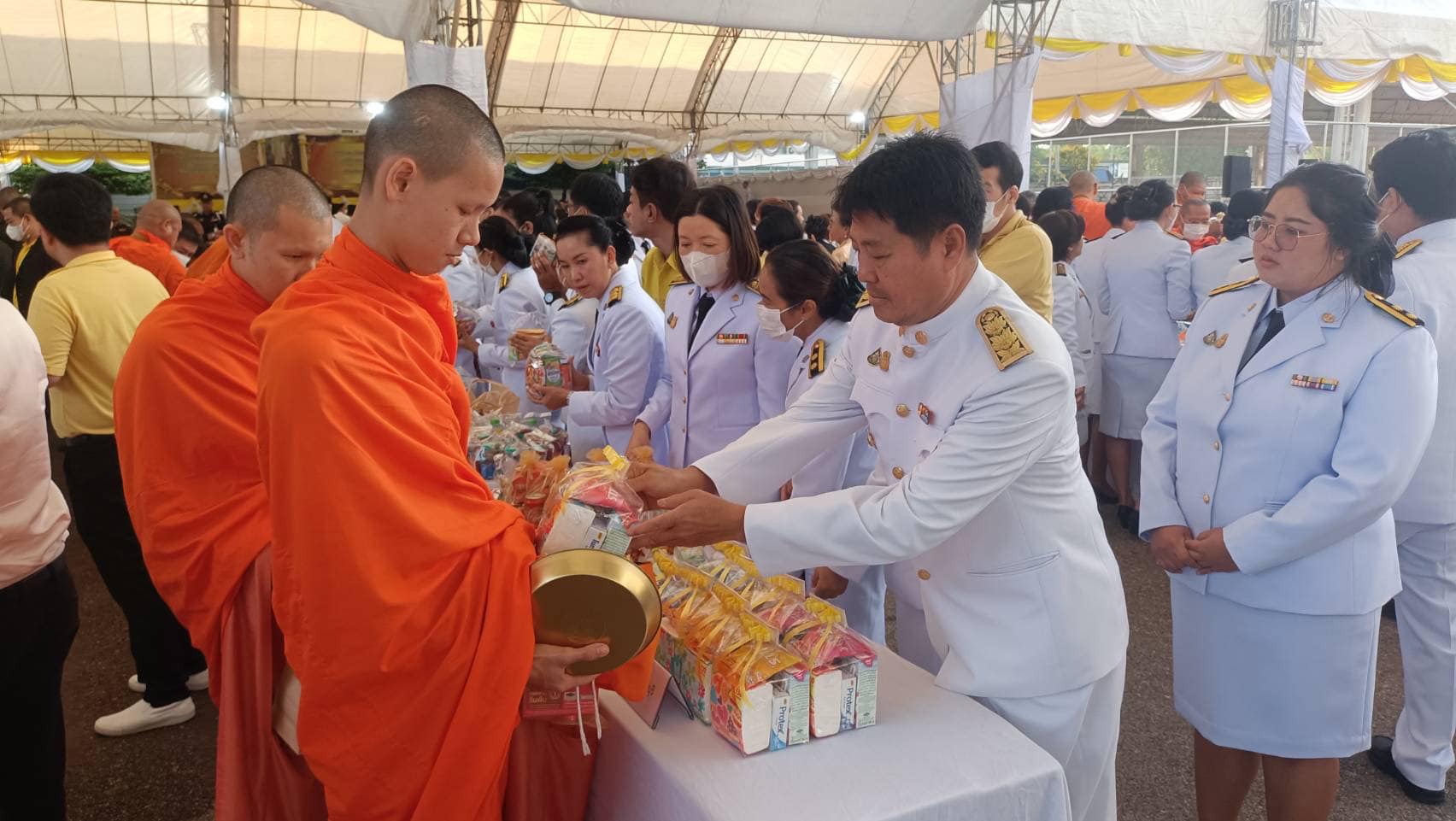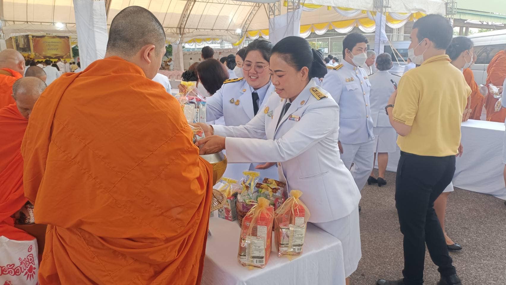 ร่วมพิธีเจริญพระพุทธมนต์และทำบุญตักบาตรถวายพระราชกุศล บริเวณด้านหน้าอาคารโรงยิมเนเซี่ยมจังหวัดราชบุรี และพิธีวางพานพุ่มดอกไม้ถวายราชสักการะ