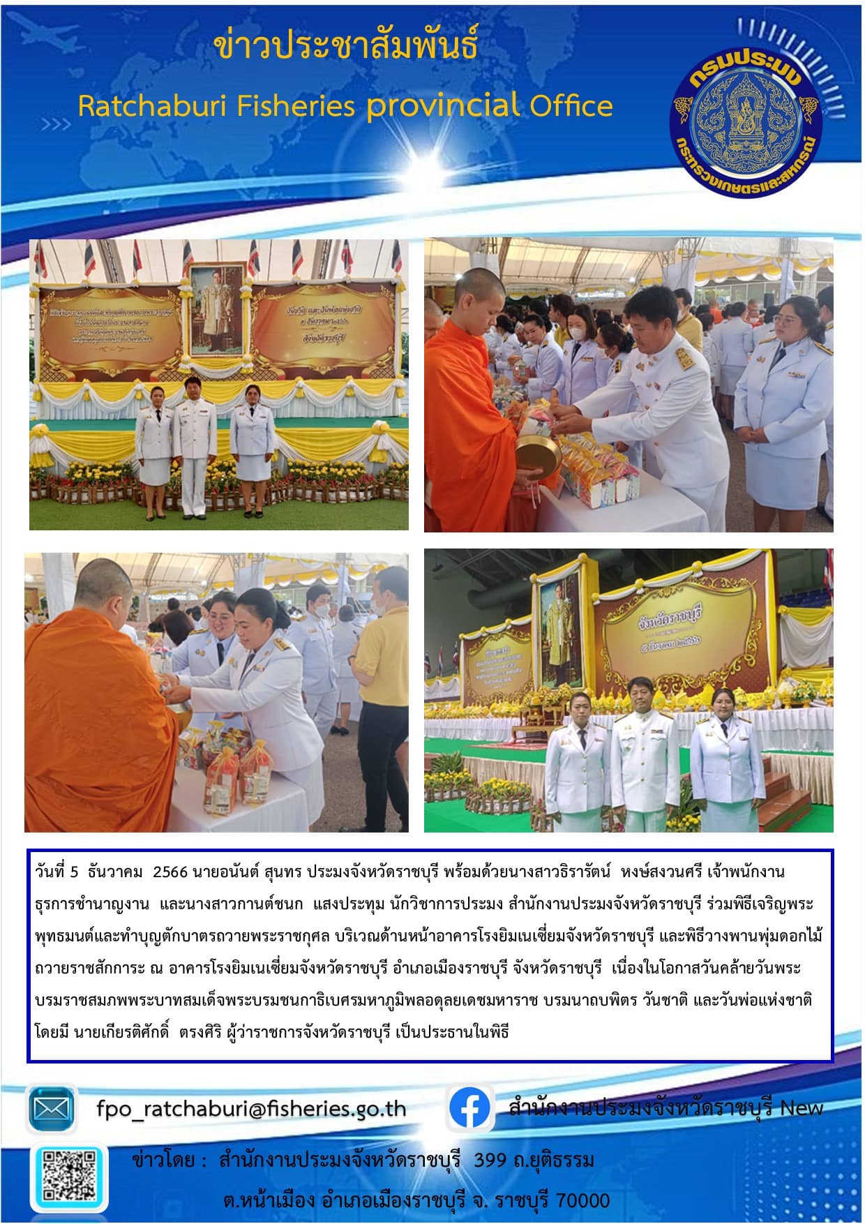 วันที่ 5 ธันวาคม 2566 นายอนันต์ สุนทร ประมงจังหวัดราชบุรี พร้อมด้วย นางสาวธิรารัตน์ หงษ์สงวนศรี เจ้าพนักงานธุรการชำนาญงาน นางสาวกานต์ชนก แสงประทุม นักวิชาการประมง สำนักงานประมงจังหวัดราชบุรี ร่วมพิธีเจริญพระพุทธมนต์และทำบุญตักบาตรถวายพระราชกุศล บริเวณด้านหน้าอาคารโรงยิมเนเซี่ยมจังหวัดราชบุรี และพิธีวางพานพุ่มดอกไม้ถวายราชสักการะ ณ อาคารโรงยิมเนเซี่ยมจังหวัดราชบุรี อำเภอเมืองราชบุรี จังหวัดราชบุรี เนื่องในโอกาสวันคล้ายวันพระบรมราชสมภพพระบาทสมเด็จพระบรมชนกาธิเบศรมหาภูมิพลอดุลยเดชมหาราช บรมนาถบพิตร วันชาติ และวันพ่อแห่งชาติ โดยมี นายเกียรติศักดิ์ ตรงศิริ ผู้ว่าราชการจังหวัดราชบุรี เป็นประธานในพิธี