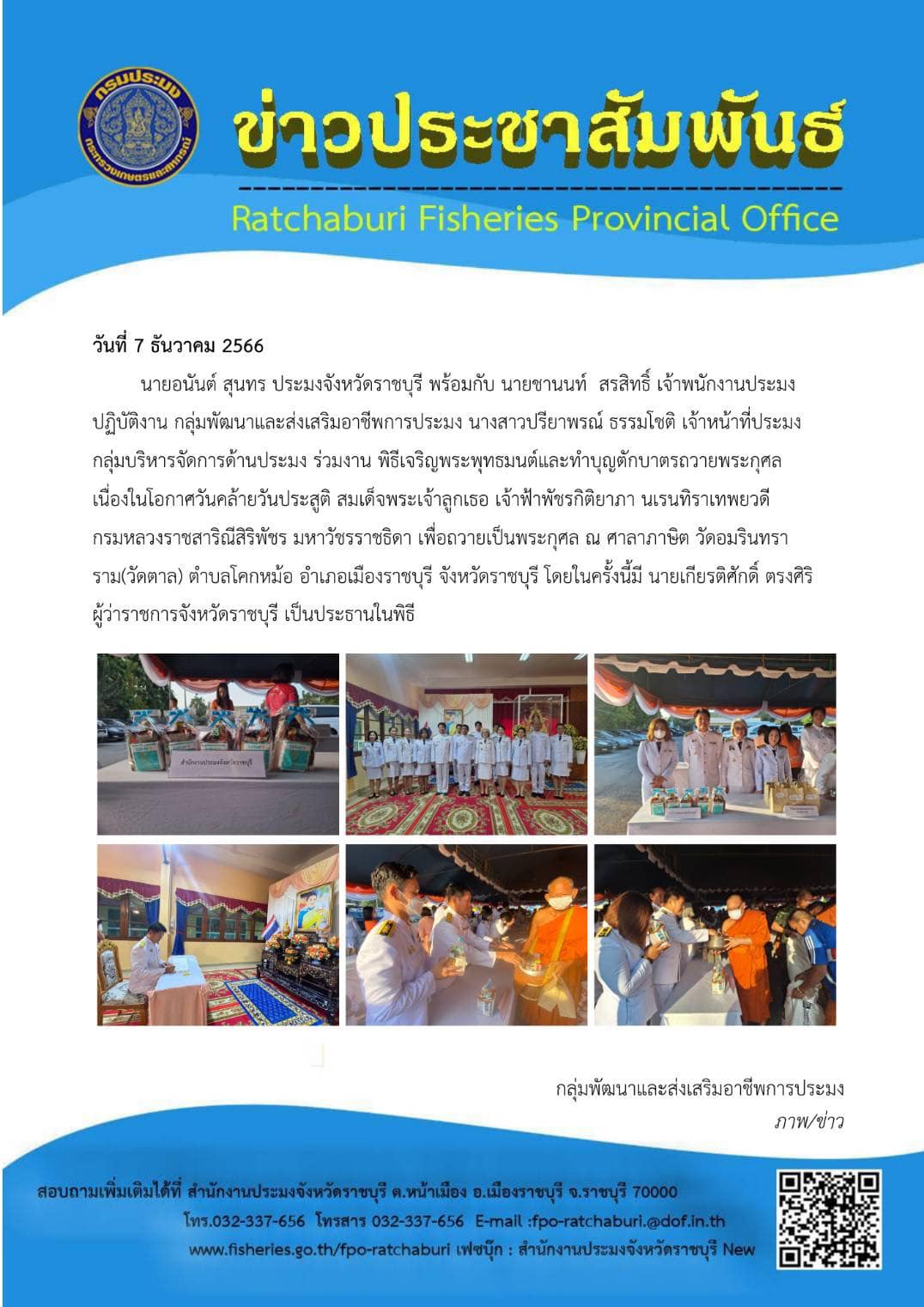 วันที่ 7 ธันวาคม 2566 นายอนันต์ สุนทร ประมงจังหวัดราชบุรี พร้อมกับ นายชานนท์ สรสิทธิ์ เจ้าพนักงานประมงปฏิบัติงาน กลุ่มพัฒนาและส่งเสริมอาชีพการประมง นางสาวปรียาพรณ์ ธรรมโชติ เจ้าหน้าที่ประมง กลุ่มบริหารจัดการด้านประมง ร่วมงาน พิธีเจริญพระพุทธมนต์และทำบุญตักบาตรถวายพระกุศล เนื่องในโอกาศวันคล้ายวันประสูติ สมเด็จพระเจ้าลูกเธอ เจ้าฟ้าพัชรกิติยาภา นเรนทิราเทพยวดี กรมหลวงราชสาริณีสิริพัชร มหาวัชรราชธิดา เพื่อถวายเป็นพระกุศล ณ ศาลาภาษิต วัดอมรินทราราม(วัดตาล) ตำบลโคกหม้อ อำเภอเมืองราชบุรี จังหวัดราชบุรี โดยในครั้งนี้มี นายเกียรติศักดิ์ ตรงศิริ ผู้ว่าราชการจังหวัดราชบุรี เป็นประธานในพิธี