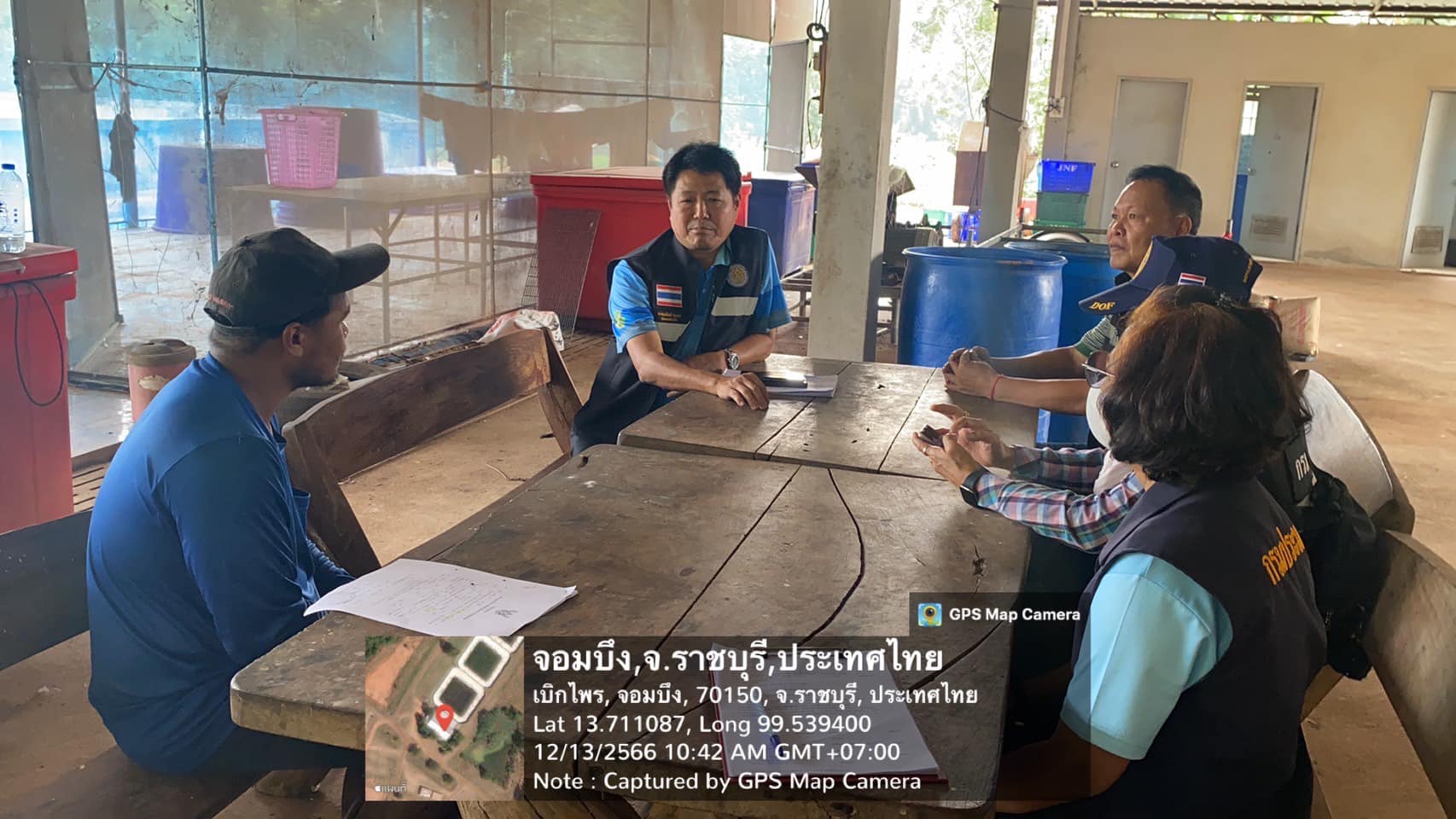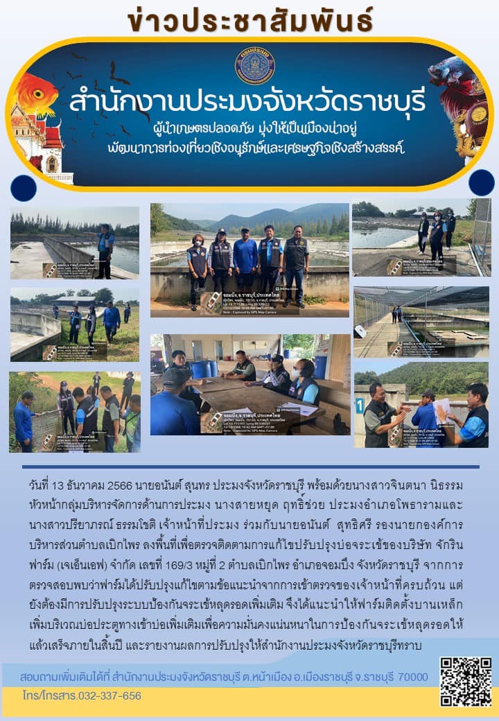 วันที่ 13 ธันวาคม 2566 นายอนันต์ สุนทร ประมงจังหวัดราชบุรี พร้อมด้วย นางสาวจินตนา นิธรรม หัวหน้ากลุ่มบริหารจัดการด้านการประมง นางสายหยุด ฤทธิ์ช่วย ประมงอำเภอโพธาราม และ นางสาวปรียาภรณ์ ธรรมโชติ เจ้าหน้าที่ประมง ร่วมกับ นายอนันต์ สุทธิศรี รองนายกองค์การบริหารส่วนตำบลเบิกไพร ลงพื้นที่เพื่อตรวจติดตามการแก้ไขปรับปรุงบ่อจระเข้ของบริษัท จักรินฟาร์ม (เจเอ็นเอฟ) จำกัด เลขที่ 169/3 หมู่ที่ 2 ตำบลเบิกไพร อำเภอจอมบึง จังหวัดราชบุรี จากการตรวจสอบพบว่าฟาร์มได้ปรับปรุงแก้ไขตามข้อแนะนำจากการเข้าตรวจของเจ้าหน้าที่ครบถ้วน แต่ยังต้องมีการปรับปรุงระบบป้องกันจระเข้หลุดรอดเพิ่มเติม จึงได้แนะนำให้ฟาร์มติดตั้งบานเหล็กเพิ่มบริเวณบ่อประตูทางเข้าบ่อเพิ่มเติมเพื่อความมั่นคงแน่นหนาในการป้องกันจระเข้หลุดรอดให้แล้วเสร็จภายในสิ้นปี และรายงานผลการปรับปรุงให้สำนักงานประมงจังหวัดราชบุรีทราบ