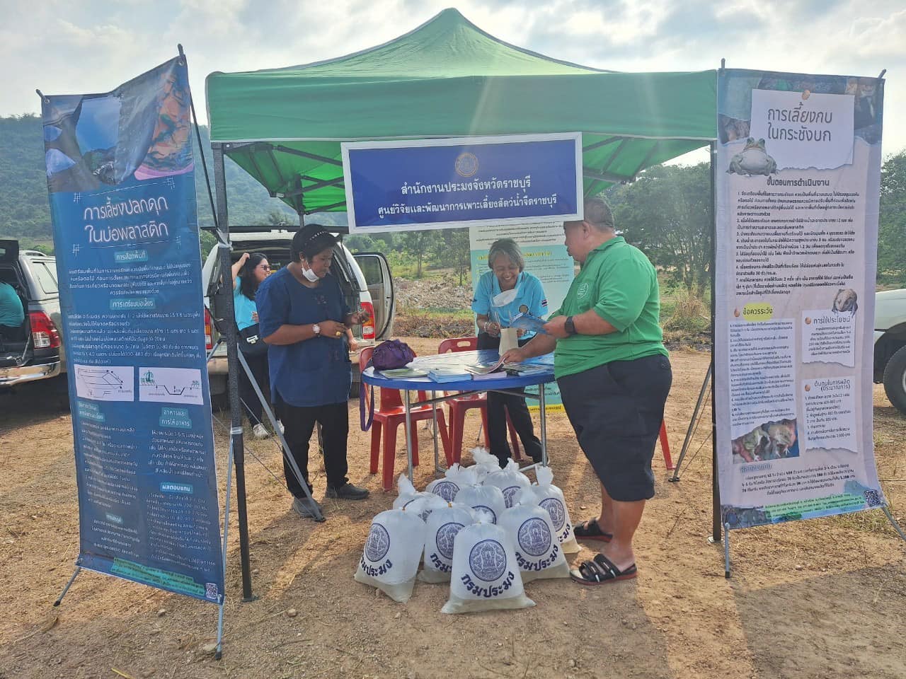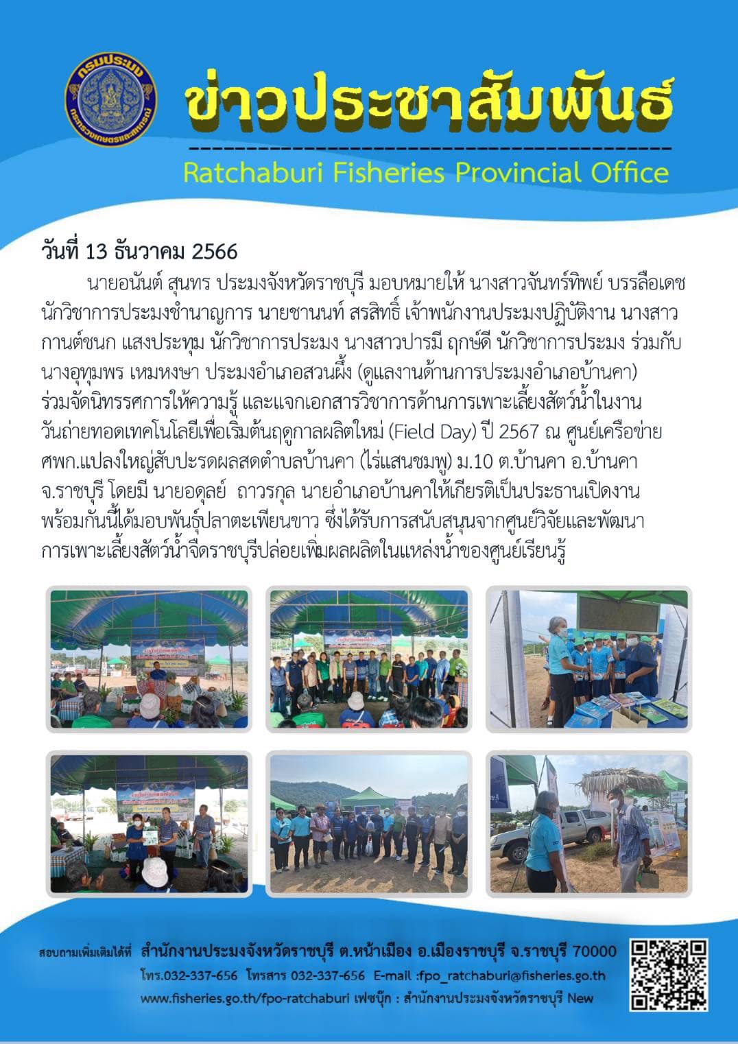 วันที่ 13 ธันวาคม 2566 นายอนันต์ สุนทร ประมงจังหวัดราชบุรี มอบหมายให้ นางสาวจันทร์ทิพย์ บรรลือเดช นักวิชาการประมงชำนาญการ นายชานนท์ สรสิทธิ์ เจ้าพนักงานประมงปฏิบัติงาน นางสาวกานต์ชนก แสงประทุม นักวิชาการประมง นางสาวปารมี ฤกษ์ดี นักวิชาการประมง ร่วมกับ นางอุทุมพร เหมหงษา ประมงอำเภอสวนผึ้ง (ดูแลงานด้านการประมงอำเภอบ้านคา) ร่วมจัดนิทรรศการให้ความรู้ และแจกเอกสารวิชาการด้านการเพาะเลี้ยงสัตว์น้ำในงานวันถ่ายทอดเทคโนโลยีเพื่อเริ่มต้นฤดูกาลผลิตใหม่ (Field Day) ปี 2567 ณ ศูนย์เครือข่าย ศพก.แปลงใหญ่สับปะรดผลสดตำบลบ้านคา (ไร่แสนชมพู) หมู่ 10 ตำบลบ้านคา อำเภอบ้านคา จังหวัดราชบุรี โดยมี นายอดุลย์ ถาวรกุล นายอำเภอบ้านคาให้เกียรติเป็นประธานเปิดงาน พร้อมกันนี้ได้มอบพันธุ์ปลาตะเพียนขาว ซึ่งได้รับการสนับสนุนจากศูนย์วิจัยและพัฒนาการเพาะเลี้ยงสัตว์น้ำจืดราชบุรีปล่อยเพิ่มผลผลิตในแหล่งน้ำของศูนย์เรียนรู้