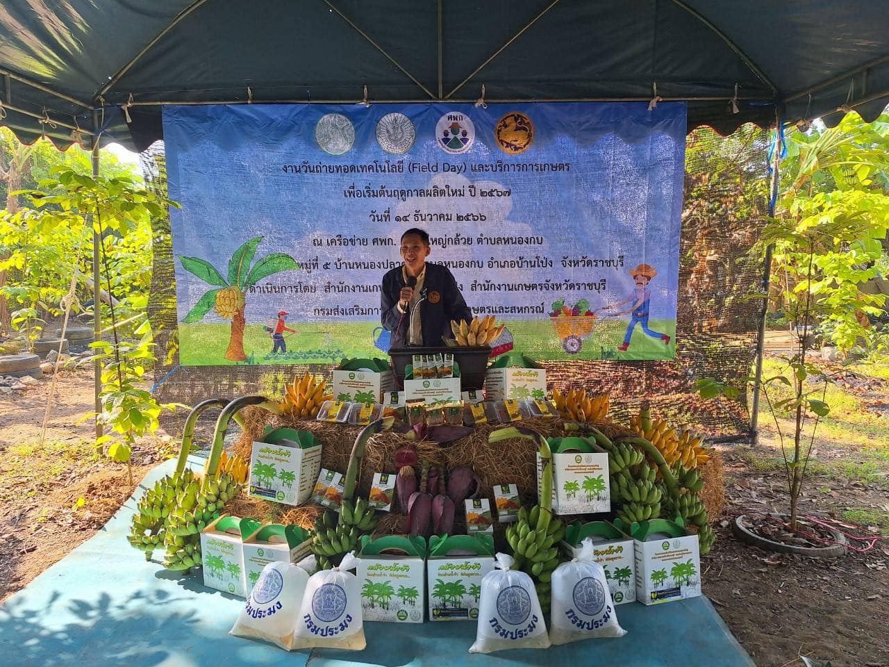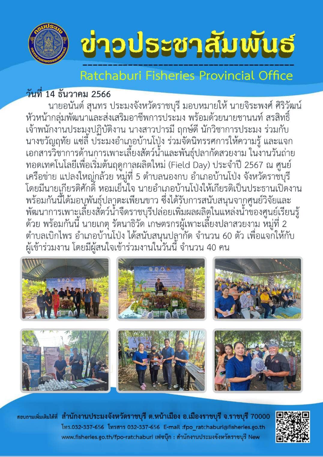 วันพฤหัสบดีที่ 14 ธันวาคม 2566 นายอนันต์ สุนทร ประมงจังหวัดราชบุรี มอบหมายให้ นายจิระพงศ์ ศิริวัฒน์ หัวหน้ากลุ่มพัฒนาและส่งเสริมอาชีพการประมง พร้อมด้วย นายชานนท์ สรสิทธิ์ เจ้าพนักงานประมงปฏิบัติงาน นางสาวปารมี ฤกษ์ดี นักวิชาการประมง ร่วมกับ นางขวัญฤทัย แซ่ลี้ ประมงอำเภอบ้านโป่ง ร่วมจัดนิทรรศการให้ความรู้ และแจกเอกสารวิชาการด้านการเพาะเลี้ยงสัตว์น้ำและพันธุ์ปลากัดสวยงาม ในงานวันถ่ายทอดเทคโนโลยีเพื่อเริ่มต้นฤดูกาลผลิตใหม่ (Field Day) ประจำปี 2567 ณ ศูนย์เครือข่าย แปลงใหญ่กล้วย หมู่ที่ 5 ตำบลนองกบ อำเภอบ้านโป่ง จังหวัดราชบุรี โดยมีนายเกียรติศักดิ์ หอมเย็นใจ นายอำเภอบ้านโป่งให้เกียรติเป็นประธานเปิดงาน พร้อมกันนี้ได้มอบพันธุ์ปลาตะเพียนขาว ซึ่งได้รับการสนับสนุนจากศูนย์วิจัยและพัฒนาการเพาะเลี้ยงสัตว์น้ำจืดราชบุรีปล่อยเพิ่มผลผลิตในแหล่งน้ำของศูนย์เรียนรู้ด้วย พร้อมกันนี้ นายเกตุ รัตนาธิวัด เกษตรกรผู้เพาะเลี้ยงปลาสวยงาม ม.2 ต.เบิกไพร อ.บ้านโป่ง ได้สนับสนุนปลากัด จำนวน 60 ตัว เพื่อแจกให้กับผู้เข้าร่วมงาน โดยมีผู้สนใจเข้าร่วมงานในวันนี้ จำนวน 40 คน