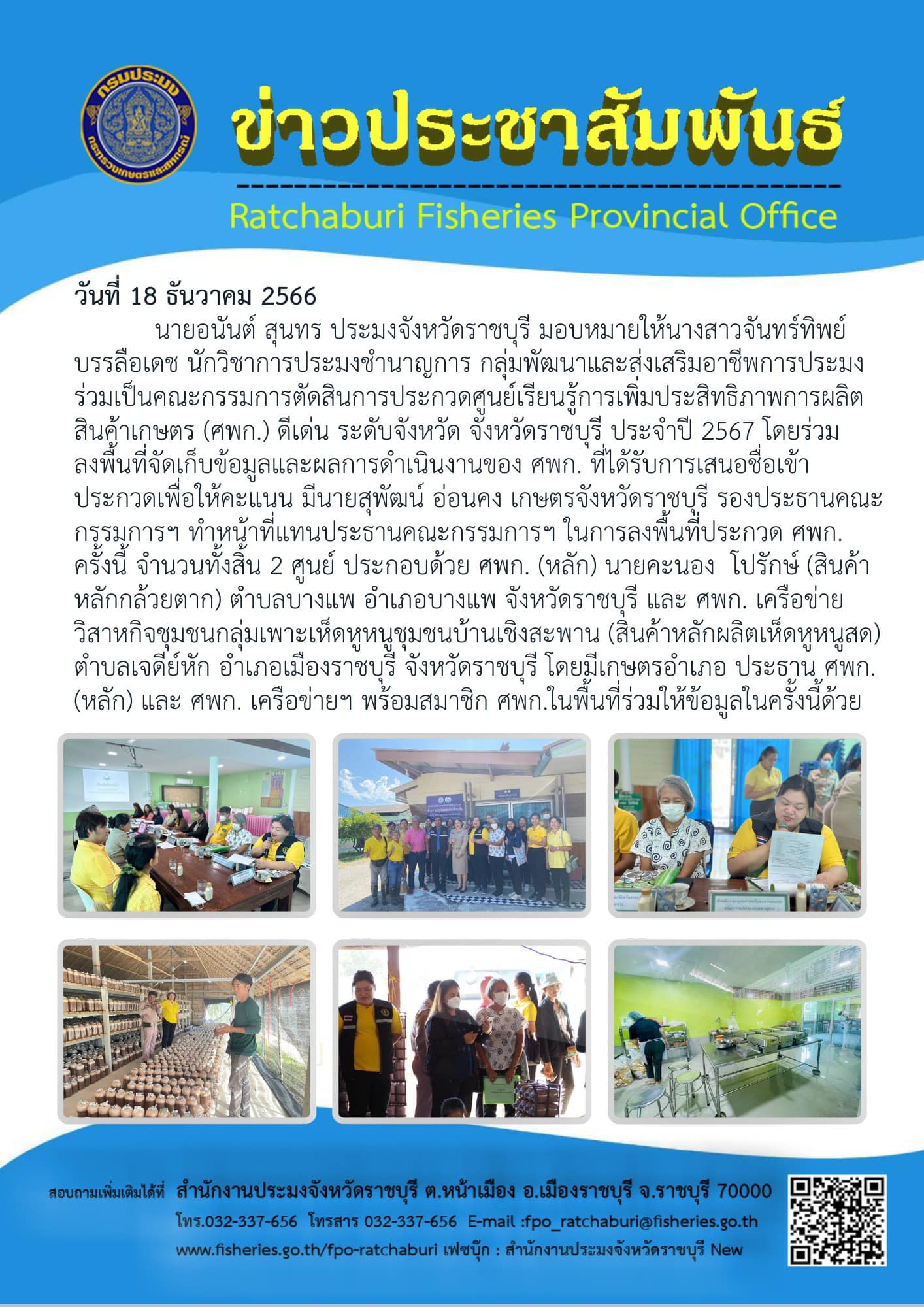 วันที่ 18 ธันวาคม 2566 นายอนันต์ สุนทร ประมงจังหวัดราชบุรี มอบหมายให้ นางสาวจันทร์ทิพย์ บรรลือเดช นักวิชาการประมงชำนาญการ กลุ่มพัฒนาและส่งเสริมอาชีพการประมง ร่วมเป็นคณะกรรมการตัดสินการประกวดศูนย์เรียนรู้การเพิ่มประสิทธิภาพการผลิตสินค้าเกษตร (ศพก.) ดีเด่น ระดับจังหวัด จังหวัดราชบุรี ประจำปี 2567 โดยร่วมลงพื้นที่จัดเก็บข้อมูลและผลการดำเนินงานของ ศพก. ที่ได้รับการเสนอชื่อเข้าประกวดเพื่อให้คะแนน มีนายสุพัฒน์ อ่อนคง เกษตรจังหวัดราชบุรี รองประธานคณะกรรมการฯ ทำหน้าที่แทนประธานคณะกรรมการฯ ในการลงพื้นที่ประกวด ศพก. ครั้งนี้ จำนวนทั้งสิ้น 2 ศูนย์ ประกอบด้วย ศพก. (หลัก) นายคะนอง โปรักษ์ (สินค้าหลักกล้วยตาก) ตำบลบางแพ อำเภอบางแพ จังหวัดราชบุรี และ ศพก. เครือข่ายวิสาหกิจชุมชนกลุ่มเพาะเห็ดหูหนูชุมชนบ้านเชิงสะพาน (สินค้าหลักผลิตเห็ดหูหนูสด) ตำบลเจดีย์หัก อำเภอเมืองราชบุรี จังหวัดราชบุรี โดยมีเกษตรอำเภอ ประธาน ศพก.(หลัก) และ ศพก. เครือข่ายฯ พร้อมสมาชิก ศพก.ในพื้นที่ร่วมให้ข้อมูลในครั้งนี้ด้วย
