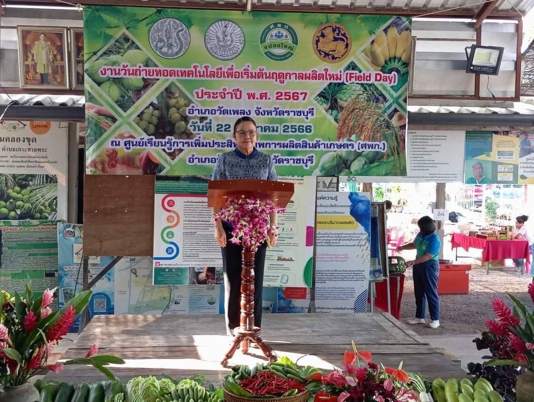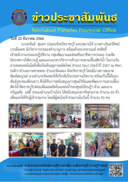 วันที่ 22 ธันวาคม 2566 นายอนันต์ สุนทร ประมงจังหวัดราชบุรี มอบหมายให้ นางสาวจันทร์ทิพย์ บรรลือเดช นักวิชาการประมงชำนาญการ พร้อมด้วย นายชานนท์ สรสิทธิ์ เจ้าพนักงานประมงปฏิบัติงาน กลุ่มพัฒนาและส่งเสริมอาชีพการประมง ร่วมจัดนิทรรศการให้ความรู้ และแจกเอกสารวิชาการด้านการเพาะเลี้ยงสัตว์น้ำ ในงานวันถ่ายทอดเทคโนโลยีเพื่อเริ่มต้นฤดูกาลผลิตใหม่ (Field Day) ประจำปี 2567 ณ ศพก. (หลัก) ตำบลเกาะศาลพระ อำเภอวัดเพลง จังหวัดราชบุรี โดยมีนางสาวสะอาด พิมพ์สมบูรณ์ นายอำเภอวัดเพลงให้เกียรติเป็นประธานเปิดงาน พร้อมกันนี้ได้มอบพันธุ์ปลาตะเพียนขาว ซึ่งได้รับการสนับสนุนจากศูนย์วิจัยและพัฒนาการเพาะเลี้ยงสัตว์น้ำจืดราชบุรีปล่อยเพิ่มผลผลิตในแหล่งน้ำของศูนย์เรียนรู้ฯ ด้วย และนางขวัญฤทัย แซ่ลี้ ประมงอำเภอบ้านโป่ง ได้สนับสนุนปลากัดสวยงาม จำนวน 60 ตัว เพื่อแจกให้กับผู้เข้าร่วมงาน โดยมีผู้สนใจเข้าร่วมงานในวันนี้ จำนวน 50 คน