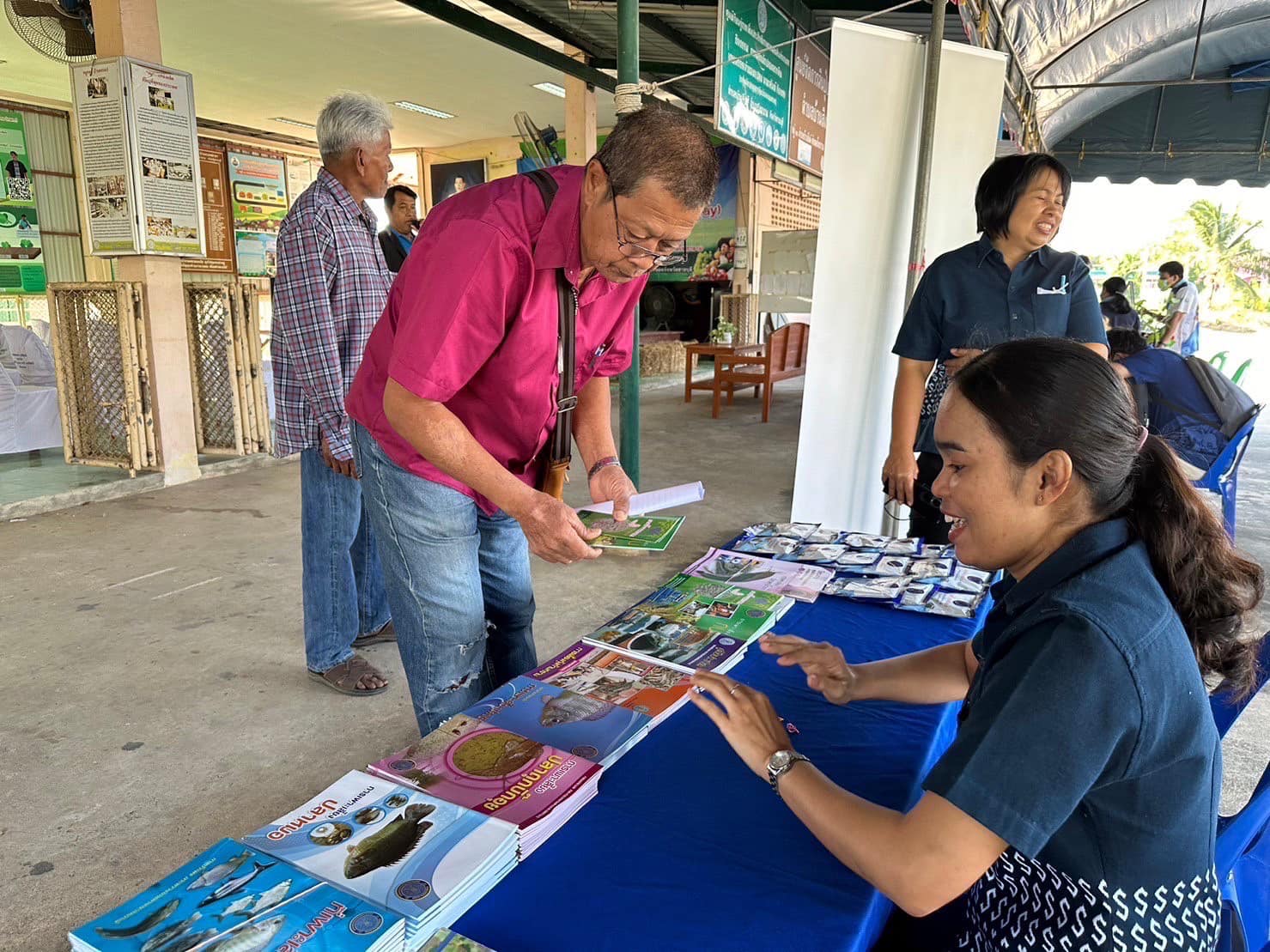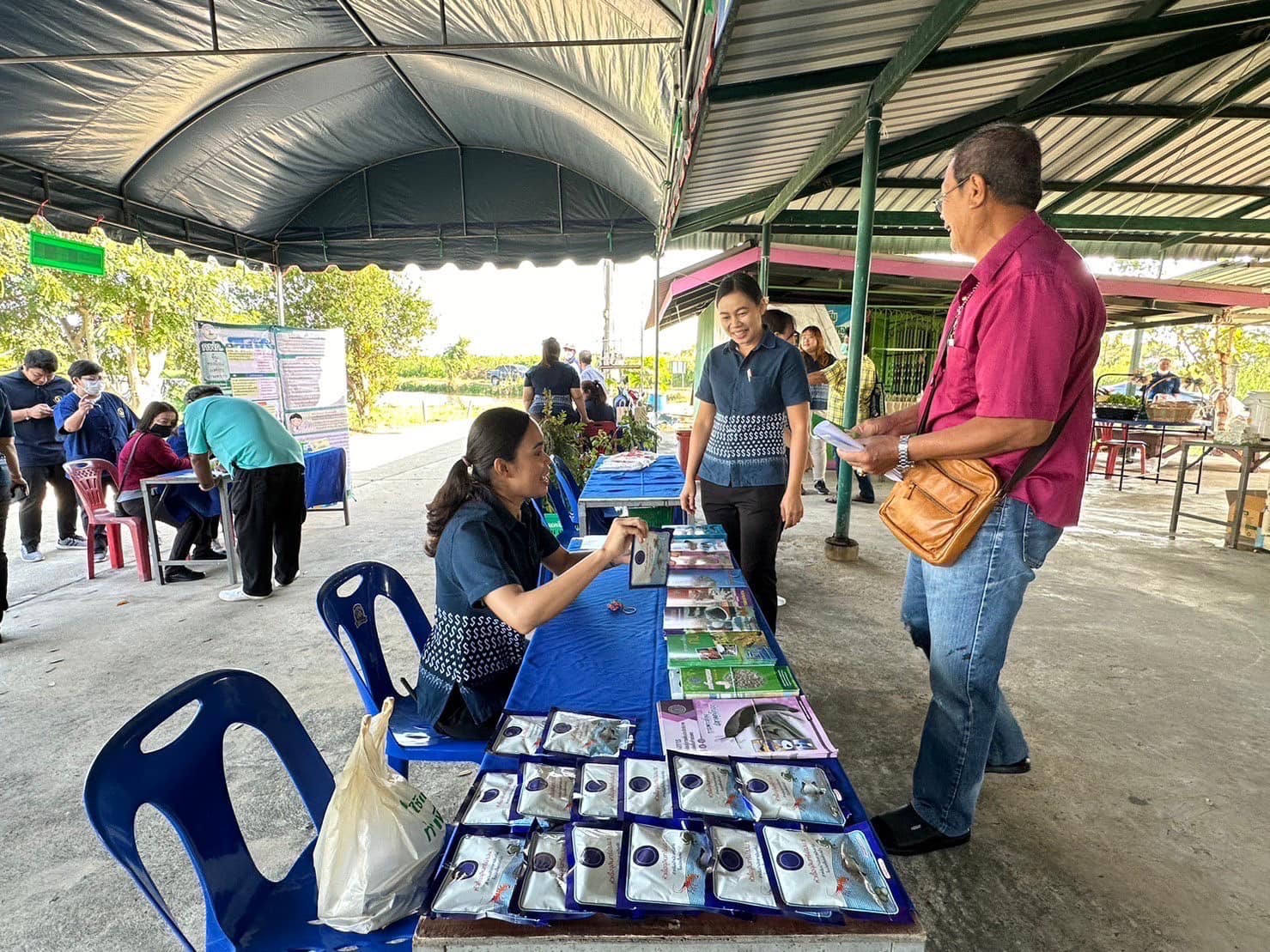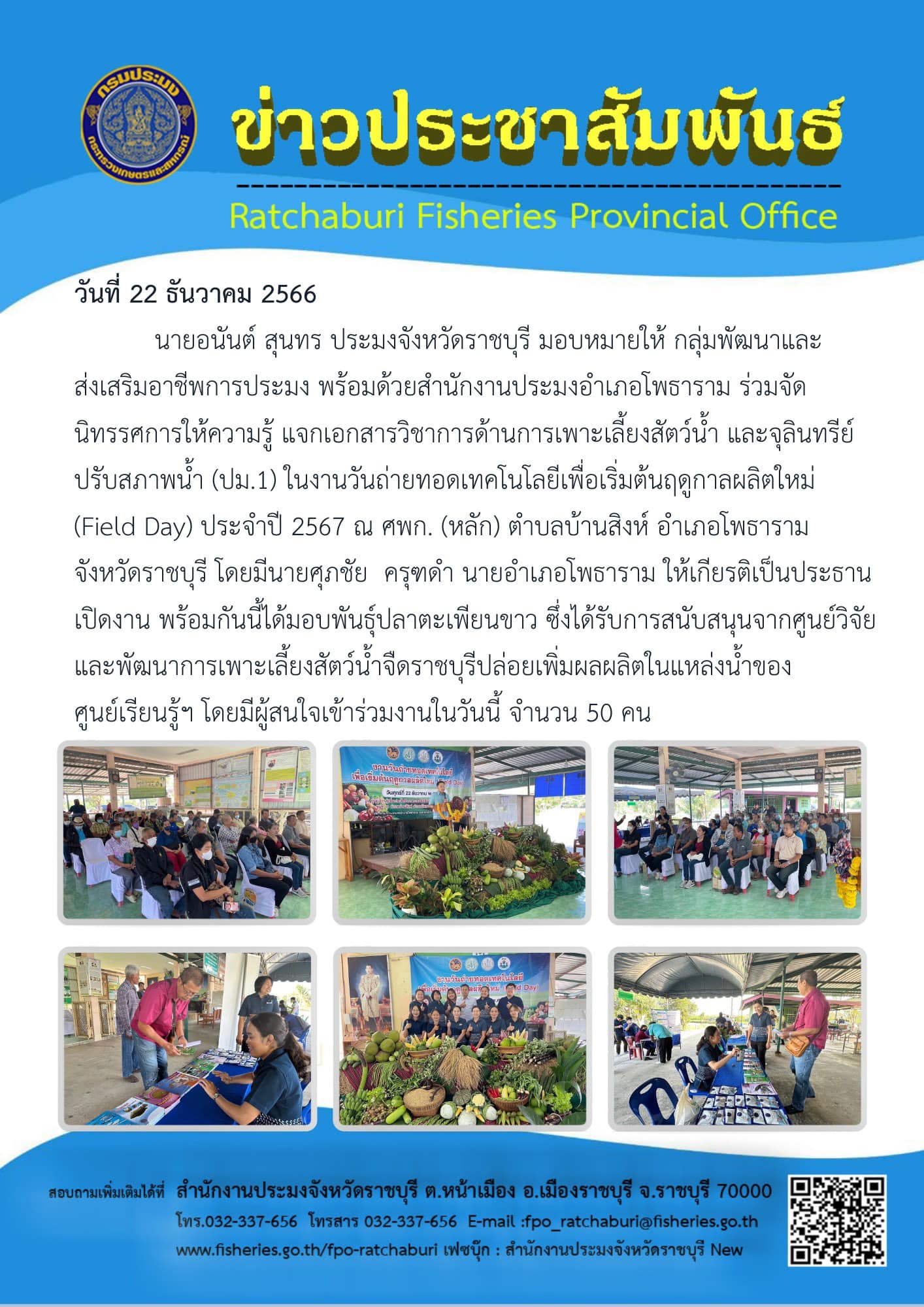 วันที่ 22 ธันวาคม 2566 นายอนันต์ สุนทร ประมงจังหวัดราชบุรี มอบหมายให้ กลุ่มพัฒนาและส่งเสริมอาชีพการประมง พร้อมด้วยสำนักงานประมงอำเภอโพธาราม ร่วมจัดนิทรรศการให้ความรู้ แจกเอกสารวิชาการด้านการเพาะเลี้ยงสัตว์น้ำ และจุลินทรีย์ปรับสภาพน้ำ (ปม.1) ในงานวันถ่ายทอดเทคโนโลยีเพื่อเริ่มต้นฤดูกาลผลิตใหม่ (Field Day) ประจำปี 2567 ณ ศพก. (หลัก) ตำบลบ้านสิงห์ อำเภอโพธาราม จังหวัดราชบุรี โดยมี นายศุภชัย ครุฑดำ นายอำเภอโพธาราม ให้เกียรติเป็นประธานเปิดงาน พร้อมกันนี้ได้มอบพันธุ์ปลาตะเพียนขาว ซึ่งได้รับการสนับสนุนจากศูนย์วิจัยและพัฒนาการเพาะเลี้ยงสัตว์น้ำจืดราชบุรีปล่อยเพิ่มผลผลิตในแหล่งน้ำของศูนย์เรียนรู้ฯ โดยมีผู้สนใจเข้าร่วมงานในวันนี้ จำนวน 50 คน