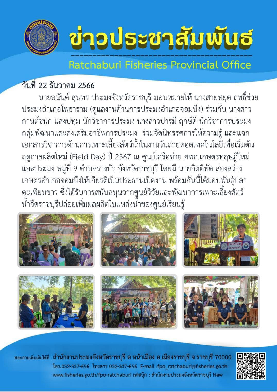 วันที่ 22 ธันวาคม 2566 นายอนันต์ สุนทร ประมงจังหวัดราชบุรี มอบหมายให้ นางสายหยุด ฤทธิ์ช่วย ประมงอำเภอโพธาราม (ดูแลงานด้านการประมงอำเภอจอมบึง) ร่วมกับ นางสาวกานต์ชนก แสงปทุม นักวิชาการประมง นางสาวปารมี ฤกษ์ดี นักวิชาการประมง กลุ่มพัฒนาและส่งเสริมอาชีพการประมง ร่วมจัดนิทรรศการให้ความรู้ และแจกเอกสารวิชาการด้านการเพาะเลี้ยงสัตว์น้ำในงานวันถ่ายทอดเทคโนโลยีเพื่อเริ่มต้นฤดูกาลผลิตใหม่ (Field Day) ปี 2567 ณ ศูนย์เครือข่าย ศพก.เกษตรทฤษฎีใหม่และประมง หมู่ที่ 9 ตำบลรางบัว จังหวัดราชบุรี โดยมี นายกิตติทัต ส่องสว่าง เกษตรอำเภอจอมบึงให้เกียรติเป็นประธานเปิดงาน พร้อมกันนี้ได้มอบพันธุ์ปลาตะเพียนขาว ซึ่งได้รับการสนับสนุนจากศูนย์วิจัยและพัฒนาการเพาะเลี้ยงสัตว์น้ำจืดราชบุรีปล่อยเพิ่มผลผลิตในแหล่งน้ำของศูนย์เรียนรู้