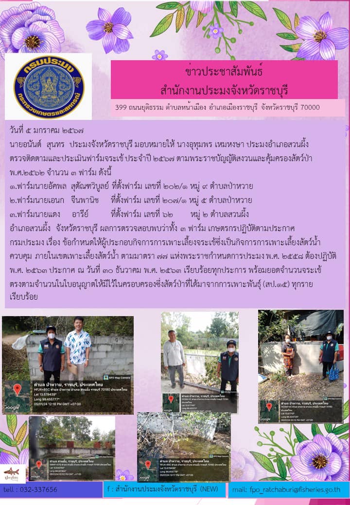 วันที่ 5 มกราคม 2567 นายอนันต์ สุนทร ประมงจังหวัดราชบุรี มอบหมายให้ นางอุทุมพร เหมหงษา ประมงอำเภอสวนผึ้ง ตรวจติดตามและประเมินฟาร์มจระเข้ ประจำปี 2567 ตามพระราชบัญญัติสงวนและคุ้มครองสัตว์ป่า พ.ศ.2562 จำนวน 3 ฟาร์ม ดังนี้