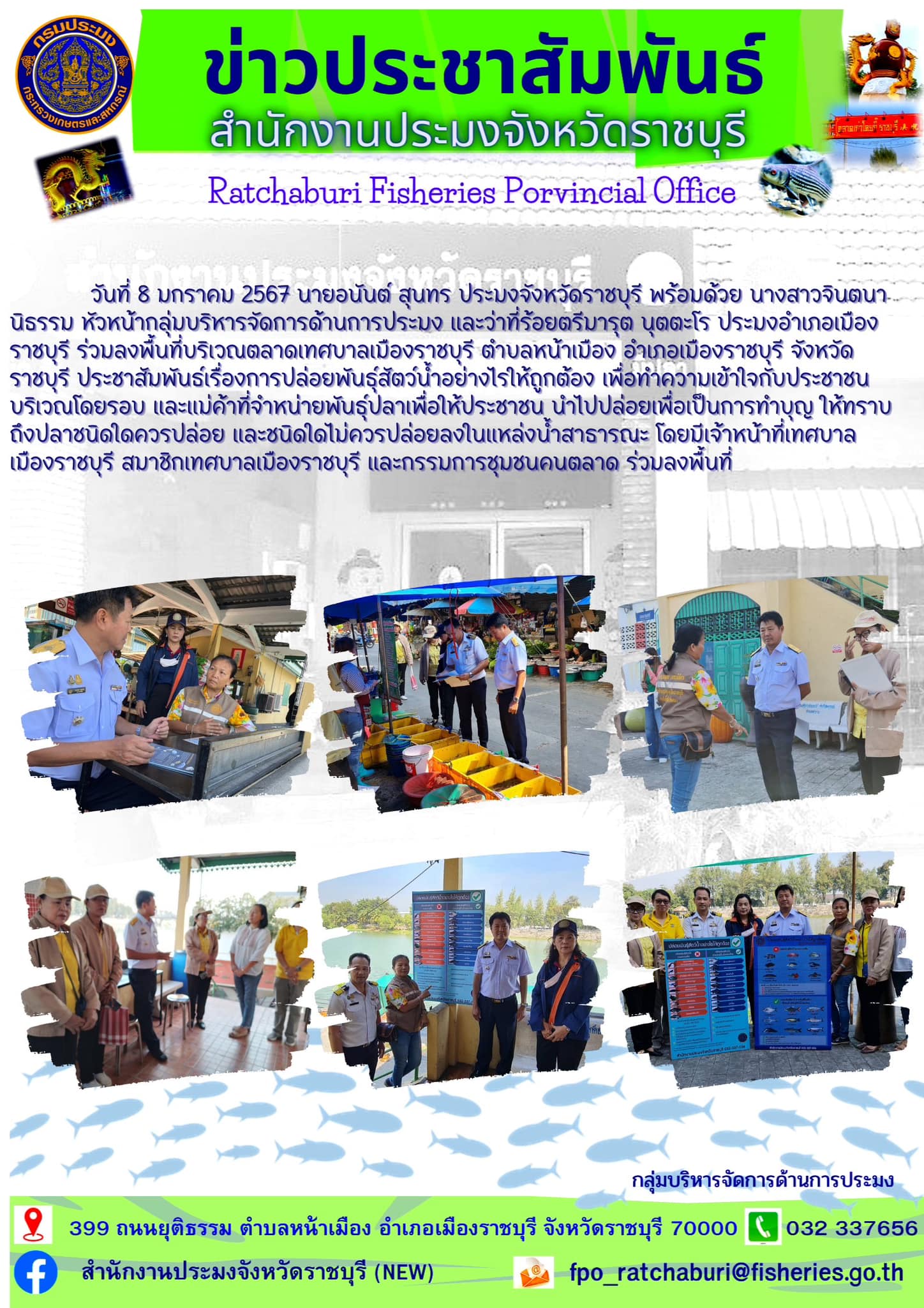 วันที่ 8 มกราคม 2567 นายอนันต์ สุนทร ประมงจังหวัดราชบุรี พร้อมด้วย นางสาวจินตนา นิธรรม หัวหน้ากลุ่มบริหารจัดการด้านการประมง และว่าที่ร้อยตรี มารุต นุตตะโร ประมงอำเภอเมืองราชบุรี ร่วมลงพื้นที่บริเวณตลาดเทศบาลเมืองราชบุรี ตำบลหน้าเมือง อำเภอเมืองราชบุรี จังหวัดราชบุรี ประชาสัมพันธ์เรื่องการปล่อยพันธุ์สัตว์น้ำอย่างไรให้ถูกต้อง เพื่อทำความเข้าใจกับประชาชนบริเวณโดยรอบ และแม่ค้าที่จำหน่ายพันธุ์ปลาเพื่อให้ประชาชนนำไปปล่อยเพื่อเป็นการทำบุญ ให้ทราบถึงปลาชนิดใดควรปล่อย และชนิดใดไม่ควรปล่อยลงในแหล่งน้ำสาธารณะ โดยมีเจ้าหน้าที่เทศบาลเมืองราชบุรี สมาชิกเทศบาลเมืองราชบุรี และกรรมการชุมชนคนตลาด ร่วมลงพื้นที่