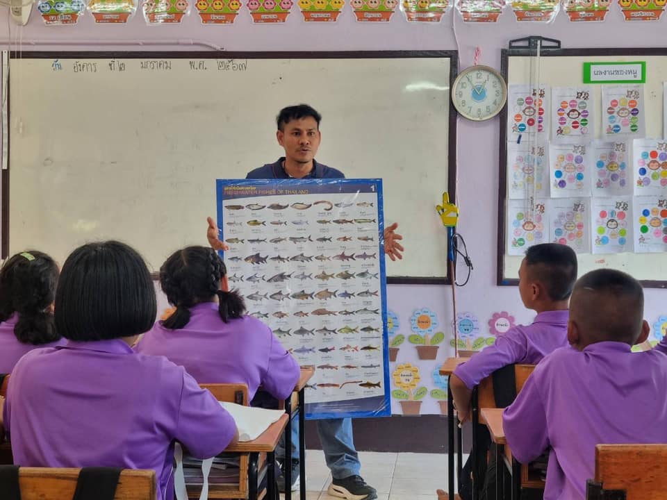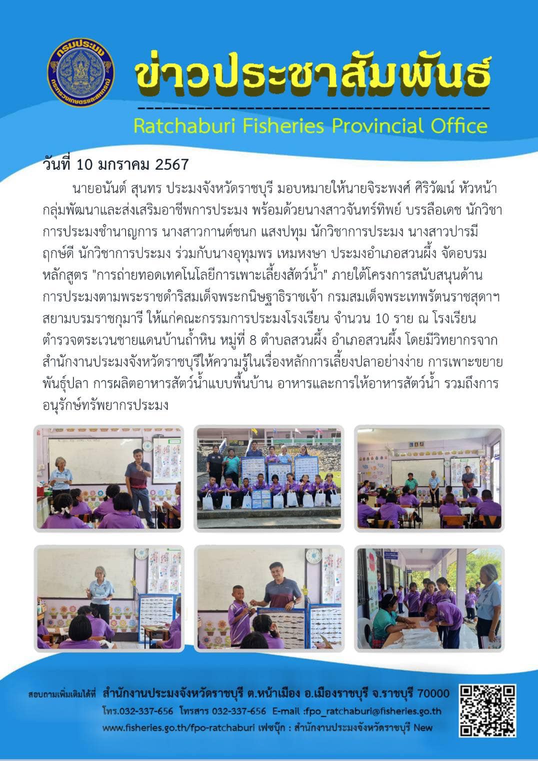 วันที่ 10 มกราคม 2567 นายอนันต์ สุนทร ประมงจังหวัดราชบุรี มอบหมายให้ นายจิระพงศ์ ศิริวัฒน์ หัวหน้ากลุ่มพัฒนาและส่งเสริมอาชีพการประมง พร้อมด้วย นางสาวจันทร์ทิพย์ บรรลือเดช นักวิชาการประมงชำนาญการ นางสาวกานต์ชนก แสงปทุม นักวิชาการประมง นางสาวปารมี ฤกษ์ดี นักวิชาการประมง ร่วมกับ นางอุทุมพร เหมหงษา ประมงอำเภอสวนผึ้ง จัดอบรม หลักสูตร "การถ่ายทอดเทคโนโลยีการเพาะเลี้ยงสัตว์น้ำ" ภายใต้โครงการสนับสนุนด้านการประมงตามพระราชดำริสมเด็จพระกนิษฐาธิราชเจ้า กรมสมเด็จพระเทพรัตนราชสุดาฯ สยามบรมราชกุมารี ให้แก่คณะกรรมการประมงโรงเรียน จำนวน 10 ราย ณ โรงเรียนตำรวจตระเวนชายแดนบ้านถ้ำหิน หมู่ที่ 8 ตำบลสวนผึ้ง อำเภอสวนผึ้ง โดยมีวิทยากรจากสำนักงานประมงจังหวัดราชบุรีให้ความรู้ในเรื่องหลักการเลี้ยงปลาอย่างง่าย การเพาะขยายพันธุ์ปลา การผลิตอาหารสัตว์น้ำแบบพื้นบ้าน อาหารและการให้อาหารสัตว์น้ำ รวมถึงการอนุรักษ์ทรัพยากรประมง