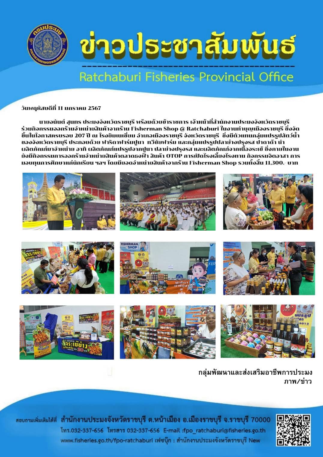 วันพฤหัสบดีที่ 11 มกราคม 2567 นายอนันต์ สุนทร ประมงจังหวัดราชบุรี พร้อมด้วย ข้าราชการ เจ้าหน้าที่สำนักงานประมงจังหวัดราชบุรี ร่วมกิจกรรมออกร้านจำหน่ายสินค้าจากร้าน Fisherman Shop @ Ratchaburi ในงานทำบุญเมืองราชบุรี ซึ่งจัดขึ้นในโอกาสครบรอบ 207 ปี ณ โรงยิมเนเซี่ยม อำเภอเมืองราชบุรี จังหวัดราชบุรี ซึ่งมีตัวแทนกลุ่มแปรรูปสัตว์น้ำของจังหวัดราชบุรี ประกอบด้วย ฟาริดาฟาร์มปูนา ทวีชัยฟาร์ม และกลุ่มแปรรูปปลาย่างปรุงรส ปาดาด้า นำผลิตภัณฑ์มาจำหน่าย อาทิ ผลิตภัณฑ์แปรรูปจากปูนา ปลาย่างปรุงรส และผลิตภัณฑ์จากเนื้อจระเข้ ซึ่งภายในงานยังมีกิจกรรมการออกร้านจำหน่ายสินค้าตลาดธงฟ้า สินค้า OTOP การเปิดโรงเลี้ยงโรงทาน กิจกรรมจิตอาสา การมอบทุนการศึกษาแก่นักเรียน ฯลฯ โดยมียอดจำหน่ายสินค้าจากร้าน Fisherman Shop รวมทั้งสิ้น 11,300.- บาท