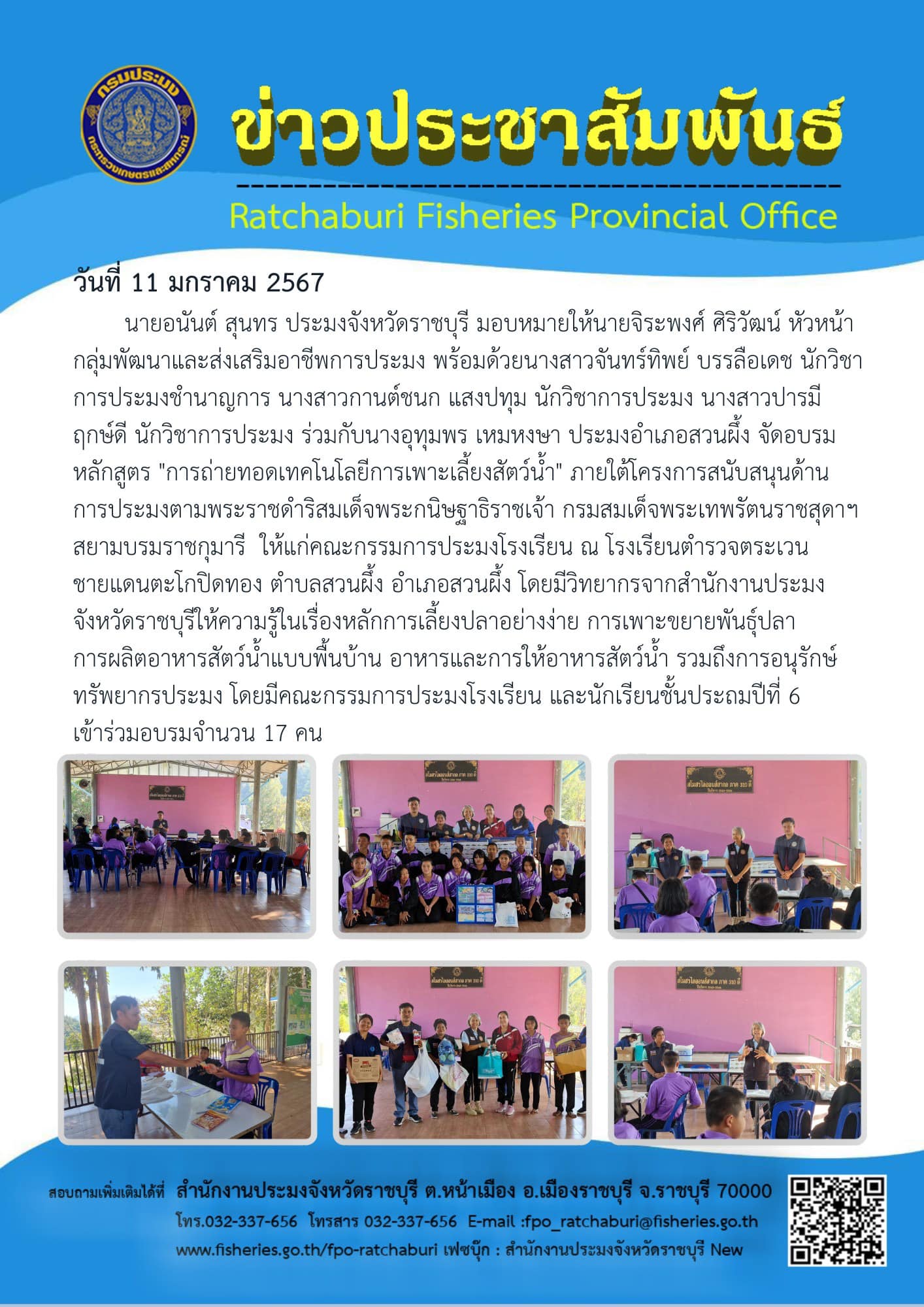 วันที่ 11 มกราคม 2567 นายอนันต์ สุนทร ประมงจังหวัดราชบุรี มอบหมายให้นายจิระพงศ์ ศิริวัฒน์ หัวหน้ากลุ่มพัฒนาและส่งเสริมอาชีพการประมง พร้อมด้วย นางสาวจันทร์ทิพย์ บรรลือเดช นักวิชาการประมงชำนาญการ นางสาวกานต์ชนก แสงปทุม นักวิชาการประมง นางสาวปารมี ฤกษ์ดี นักวิชาการประมง ร่วมกับนางอุทุมพร เหมหงษา ประมงอำเภอสวนผึ้ง จัดอบรม หลักสูตร "การถ่ายทอดเทคโนโลยีการเพาะเลี้ยงสัตว์น้ำ" ภายใต้โครงการสนับสนุนด้านการประมงตามพระราชดำริสมเด็จพระกนิษฐาธิราชเจ้า กรมสมเด็จพระเทพรัตนราชสุดาฯ สยามบรมราชกุมารี ให้แก่คณะกรรมการประมงโรงเรียน ณ โรงเรียนตำรวจตระเวนชายแดนตะโกปิดทอง ตำบลสวนผึ้ง อำเภอสวนผึ้ง โดยมีวิทยากรจากสำนักงานประมงจังหวัดราชบุรีให้ความรู้ในเรื่องหลักการเลี้ยงปลาอย่างง่าย การเพาะขยายพันธุ์ปลา การผลิตอาหารสัตว์น้ำแบบพื้นบ้าน อาหารและการให้อาหารสัตว์น้ำ รวมถึงการอนุรักษ์ทรัพยากรประมง โดยมีคณะกรรมการประมงโรงเรียน และนักเรียนชั้นประถมปีที่ 6 เข้าร่วมอบรมจำนวน 17 คน
