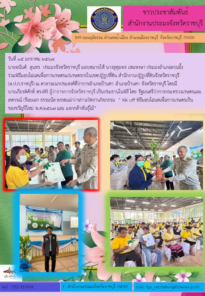 วันที่ 15 มกราคม 2567 นายอนันต์ สุนทร ประมงจังหวัดราชบุรี มอบหมายให้ นางอุทุมพร เหมหงษา ประมงอำเภอสวนผึ้ง ร่วมพิธีมอบโฉนดเพื่อการเกษตรแก่ เกษตรกรในเขตปฏิรูปที่ดิน สำนักงานปฏิรูปที่ดินจังหวัดราชบุรี (ส.ป.ก.ราชบุรี) ณ ศาลาอเนกประสงค์ที่ว่าการอำเภอบ้านคา อำเภอบ้านคา จังหวัดราชบุรี โดยมี นายเกียรติศักดิ์ ตรงศิริ ผู้ว่าราชการจังหวัดราชบุรี เป็นประธานในพิธี โดย รัฐมนตรีว่าการกระทรวงเกษตรและสหกรณ์ (ร้อยเอก ธรรมนัส พรหมเผ่า) กล่าวเปิดงานกิจกรรม “ Kik off พิธีมอบโฉนดเพื่อการเกษตรเป็นของขวัญปีใหม่ พ.ศ.2567 และ แจกกล้าพันธุ์ไม้”