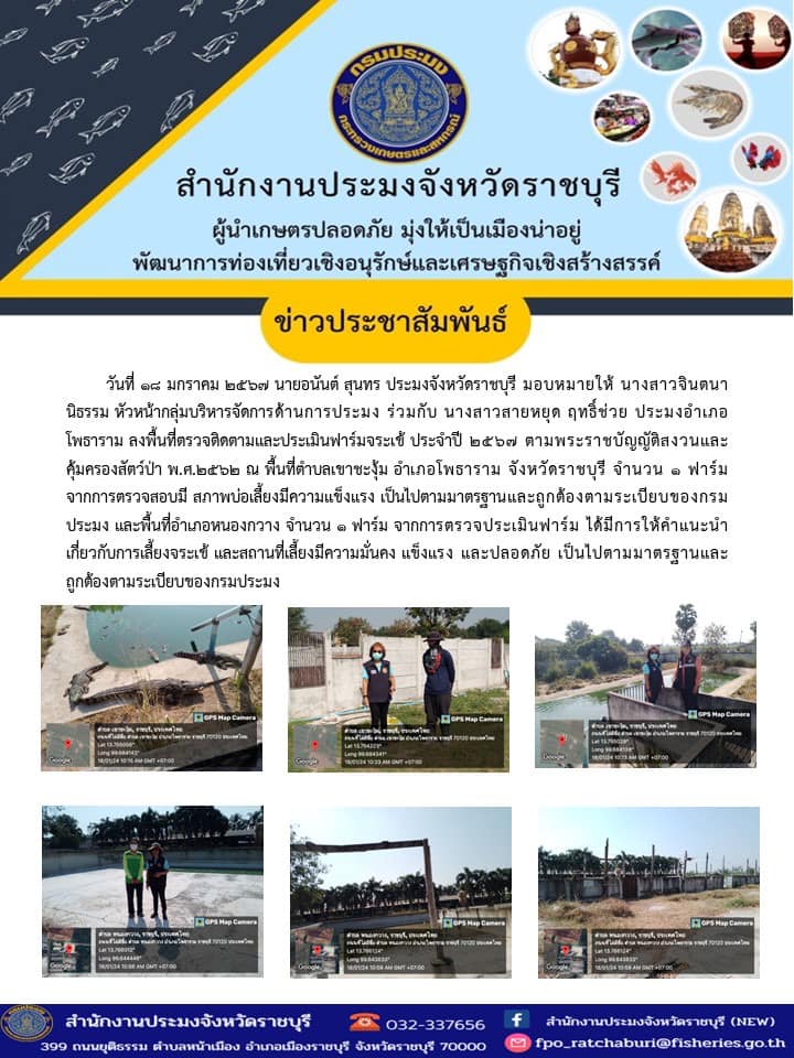วันที่ 18 มกราคม 2567 นายอนันต์ สุนทร ประมงจังหวัดราชบุรี มอบหมายให้ นางสาวจินตนา นิธรรม หัวหน้ากลุ่มบริหารจัดการด้านการประมง ร่วมกับ นางสายหยุด ฤทธิ์ช่วย ประมงอำเภอโพธาราม ลงพื้นที่ตรวจติดตามและประเมินฟาร์มจระเข้ ประจำปี 2567 ตามพระราชบัญญัติสงวนและคุ้มครองสัตว์ป่า พ.ศ.2562 ณ พื้นที่ตำบลเขาชะงุ้ม อำเภอโพธาราม จังหวัดราชบุรี จำนวน 1 ฟาร์ม จากการตรวจสอบมีสภาพบ่อเลี้ยงมีความแข็งแรง เป็นไปตามมาตรฐานและถูกต้องตามระเบียบของกรมประมง และพื้นที่อำเภอหนองกวาง จำนวน 1 ฟาร์ม จากการตรวจประเมินฟาร์ม ได้มีการให้คำแนะนำเกี่ยวกับการเลี้ยงจระเข้ และสถานที่เลี้ยงมีความมั่นคง แข็งแรง และปลอดภัย เป็นไปตามมาตรฐานและถูกต้องตามระเบียบของกรมประมง
