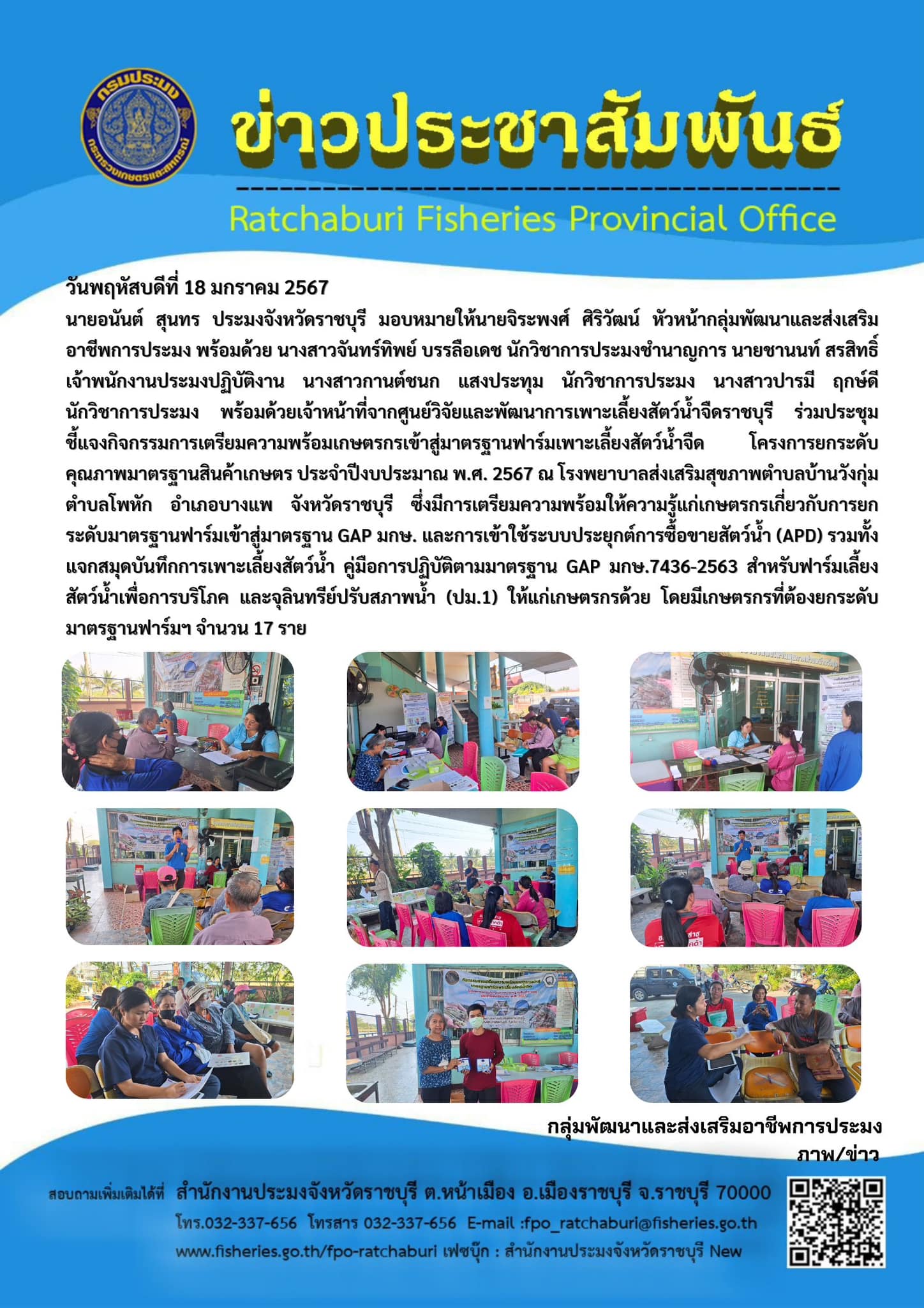 วันพฤหัสบดีที่ 18 มกราคม 2567 นายอนันต์ สุนทร ประมงจังหวัดราชบุรี มอบหมายให้นายจิระพงศ์ ศิริวัฒน์ หัวหน้ากลุ่มพัฒนาและส่งเสริมอาชีพการประมง พร้อมด้วย นางสาวจันทร์ทิพย์ บรรลือเดช นักวิชาการประมงชำนาญการ นายชานนท์ สรสิทธิ์ เจ้าพนักงานประมงปฏิบัติงาน นางสาวกานต์ชนก แสงประทุม นักวิชาการประมง นางสาวปารมี ฤกษ์ดี นักวิชาการประมง พร้อมด้วย เจ้าหน้าที่จากศูนย์วิจัยและพัฒนาการเพาะเลี้ยงสัตว์น้ำจืดราชบุรี ร่วมประชุมชี้แจงกิจกรรมการเตรียมความพร้อมเกษตรกรเข้าสู่มาตรฐานฟาร์มเพาะเลี้ยงสัตว์น้ำจืด โครงการยกระดับคุณภาพมาตรฐานสินค้าเกษตร ประจำปีงบประมาณ พ.ศ. 2567 ณ โรงพยาบาลส่งเสริมสุขภาพตำบลบ้านวังกุ่ม ตำบลโพหัก อำเภอบางแพ จังหวัดราชบุรี ซึ่งมีการเตรียมความพร้อมให้ความรู้แก่เกษตรกรเกี่ยวกับการยกระดับมาตรฐานฟาร์มเข้าสู่มาตรฐาน GAP มกษ. และการเข้าใช้ระบบประยุกต์การซื้อขายสัตว์น้ำ (APD) รวมทั้งแจกสมุดบันทึกการเพาะเลี้ยงสัตว์น้ำ คู่มือการปฏิบัติตามมาตรฐาน GAP มกษ.7436-2563 สำหรับฟาร์มเลี้ยงสัตว์น้ำเพื่อการบริโภค และจุลินทรีย์ปรับสภาพน้ำ (ปม.1) ให้แก่เกษตรกรด้วย โดยมีเกษตรกรที่ต้องยกระดับมาตรฐานฟาร์มฯ จำนวน 17 ราย