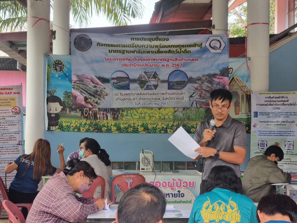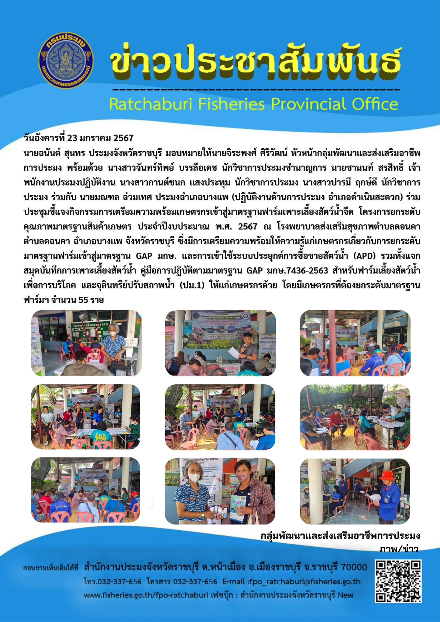 วันอังคารที่ 23 มกราคม 2567 นายอนันต์ สุนทร ประมงจังหวัดราชบุรี มอบหมายให้นายจิระพงศ์ ศิริวัฒน์ หัวหน้ากลุ่มพัฒนาและส่งเสริมอาชีพการประมง พร้อมด้วย นางสาวจันทร์ทิพย์ บรรลือเดช นักวิชาการประมงชำนาญการ นายชานนท์ สรสิทธิ์ เจ้าพนักงานประมงปฏิบัติงาน นางสาวกานต์ชนก แสงประทุม นักวิชาการประมง นางสาวปารมี ฤกษ์ดี นักวิชาการประมง ร่วมกับ นายมณฑล อ่วมเทศ ประมงอำเภอบางแพ (ปฏิบัติงานด้านการประมง อำเภอดำเนินสะดวก) ร่วมประชุมชี้แจงกิจกรรมการเตรียมความพร้อมเกษตรกรเข้าสู่มาตรฐานฟาร์มเพาะเลี้ยงสัตว์น้ำจืด โครงการยกระดับคุณภาพมาตรฐานสินค้าเกษตร ประจำปีงบประมาณ พ.ศ. 2567 ณ โรงพยาบาลส่งเสริมสุขภาพตำบลดอนคา ตำบลดอนคา อำเภอบางแพ จังหวัดราชบุรี ซึ่งมีการเตรียมความพร้อมให้ความรู้แก่เกษตรกรเกี่ยวกับการยกระดับมาตรฐานฟาร์มเข้าสู่มาตรฐาน GAP มกษ. และการเข้าใช้ระบบประยุกต์การซื้อขายสัตว์น้ำ (APD) รวมทั้งแจกสมุดบันทึกการเพาะเลี้ยงสัตว์น้ำ คู่มือการปฏิบัติตามมาตรฐาน GAP มกษ.7436-2563 สำหรับฟาร์มเลี้ยงสัตว์น้ำเพื่อการบริโภค และจุลินทรีย์ปรับสภาพน้ำ (ปม.1) ให้แก่เกษตรกรด้วย โดยมีเกษตรกรที่ต้องยกระดับมาตรฐานฟาร์มฯ จำนวน 55 ราย