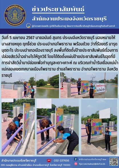 วันที่ 5 เมษายน 2567 นายอนันต์ สุนทร ประมงจังหวัดราชบุรี มอบหมายให้ นางสายหยุด ฤทธิ์ช่วย ประมงอำเภอโพธาราม พร้อมด้วย ว่าที่ร้อยตรี มารุต นุตตะโร ประมงอำเภอเมืองราชบุรี ลงพื้นที่ติดตั้งป้ายประชาสัมพันธ์เรื่องการปล่อยสัตว์น้ำอย่างไรให้ถูกวิธี โดยได้ติดตั้งแผ่นป้ายประชาสัมพันธ์ในจุดที่มีการนำสัตว์น้ำมาปล่อยเพื่อทำบุญสะเดาะเคาะห์ ณ บริเวณท่าน้ำริมเขื่อนแม่น้ำแม่กลองเขตเทศบาลเมืองโพธาราม ตำบลโพธาราม อำเภอโพธาราม จังหวัดราชบุรี