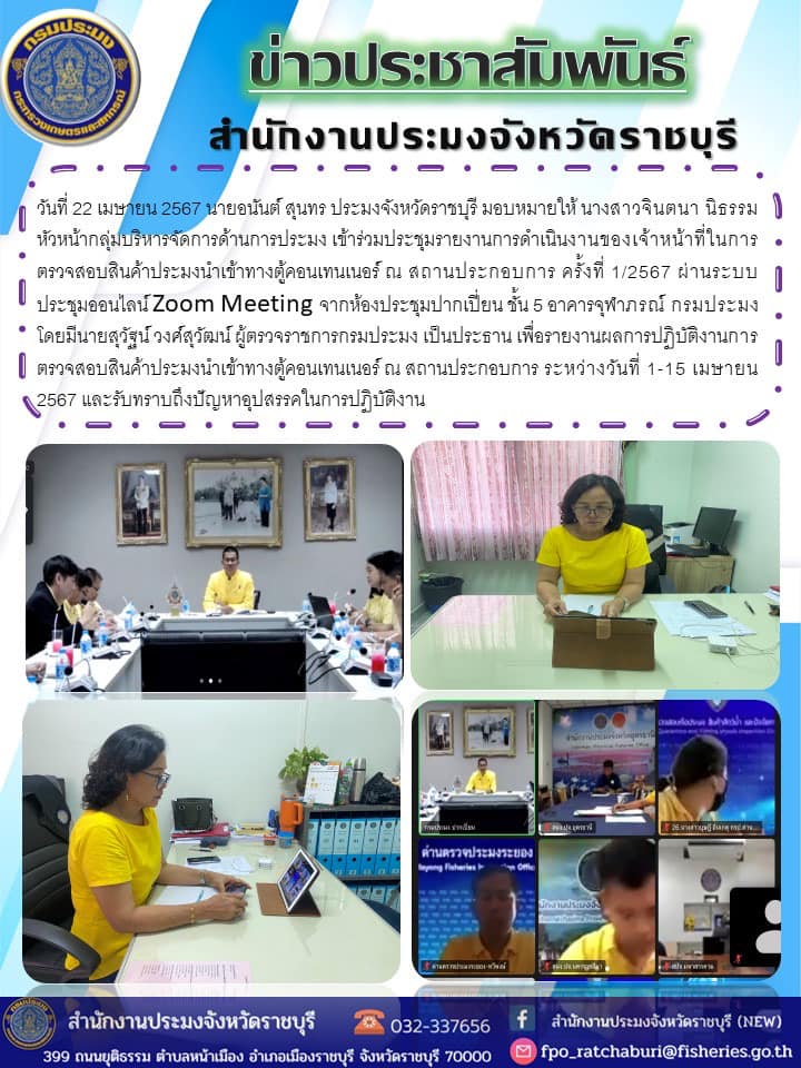 วันที่ 22 เมษายน 2567 นายอนันต์ สุนทร ประมงจังหวัดราชบุรี มอบหมายให้ นางสาวจินตนา นิธรรม หัวหน้ากลุ่มบริหารจัดการด้านการประมง เข้าร่วมประชุมรายงานการดำเนินงานของเจ้าหน้าที่ในการตรวจสอบสินค้าประมงนำเข้าทางตู้คอนเทนเนอร์ ณ สถานประกอบการ ครั้งที่ 1/2567 ผ่านระบบประชุมออนไลน์ Zoom Meeting จากห้องประชุมปากเปี่ยน ชั้น 5 อาคารจุฬาภรณ์ กรมประมง โดยมีนายสุวัฐน์ วงศ์สุวัฒน์ ผู้ตรวจราชการกรมประมง เป็นประธาน เพื่อรายงานผลการปฏิบัติงานการตรวจสอบสินค้าประมงนำเข้าทางตู้คอนเทนเนอร์ ณ สถานประกอบการ ระหว่างวันที่ 1-15 เมษายน 2567 และรับทราบถึงปัญหาอุปสรรคในการปฏิบัติงาน