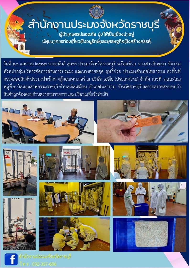 วันที่ 30 เมษายน 2567 นายอนันต์ สุนทร ประมงจังหวัดราชบุรี พร้อมด้วย นางสาวจินตนา นิธรรม หัวหน้ากลุ่มบริหารจัดการด้านการประมง และนางสายหยุด ฤทธิ์ช่วย ประมงอำเภอโพธาราม ลงพื้นที่ตรวจสอบสินค้าประมงนำเข้าทางตู้คอนเทนเนอร์ ณ บริษัท เออิโย (ประเทศไทย) จำกัด เลขที่ 155/58 หมู่ที่ 4 นิคมอุตสาหกรรมราชบุรี ตำบลเจ็ดเสมียน อำเภอโพธาราม จังหวัดราชบุรี ผลการตรวจสอบพบว่าสินค้าถูกต้องครบถ้วนตรงตามรายการและปริมาณที่แจ้งนำเข้า