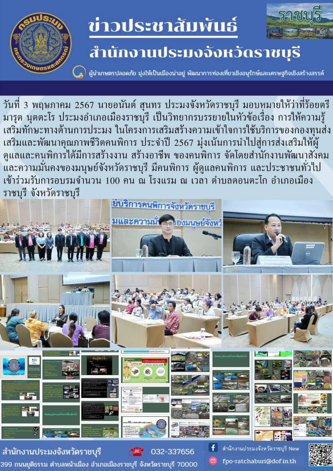 วันที่ 3 พฤษภาคม 2567 นายอนันต์ สุนทร ประมงจังหวัดราชบุรี มอบหมายให้ ว่าที่ร้อยตรีมารุต นุตตะโร ประมงอำเภอเมืองราชบุรี เป็นวิทยากรบรรยายในหัวข้อเรื่อง การให้ความรู้เสริมทักษะทางด้านการประมง ในโครงการเสริมสร้างความเข้าใจการใช้บริการของกองทุนส่งเสริมและพัฒนาคุณภาพชีวิตคนพิการ ประจำปี 2567 มุ่งเน้นการนำไปสู่การส่งเสริมให้ผู้ดูแลและคนพิการได้มีการสร้างงาน สร้างอาชีพ ของคนพิการ จัดโดยสำนักงานพัฒนาสังคมและความมั่นคงของมนุษย์จังหวัดราชบุรี มีคนพิการ ผู้ดูแลคนพิการ และประชาชนทั่วไป เข้าร่วมรับการอบรมจำนวน 100 คน ณ โรงแรม ณ เวลา ตำบลดอนตะโก อำเภอเมืองราชบุรี จังหวัดราชบุรี