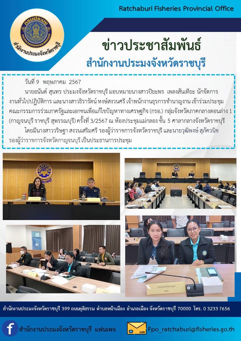 วันที่ 9 พฤษภาคม 2567 นายอนันต์ สุนทร ประมงจังหวัดราชบุรี มอบหมายนางสาวปิยะพร เพลงสันเทียะ นักจัดการงานทั่วไปปฏิบัติการ และนางสาวธิรารัตน์ หงษ์สงวนศรี เจ้าพนักงานธุรการชำนาญงาน เข้าร่วมประชุมคณะกรรมการร่วมภาครัฐและเอกชนเพื่อแก้ไขปัญหาทางเศรษฐกิจ (กรอ.) กลุ่มจังหวัดภาคกลางตอนล่าง 1 (กาญจนบุรี ราชบุรี สุพรรณบุรี) ครั้งที่ 3/2567 ณ ห้องประชุมแม่กลอง ชั้น 5 ศาลากลางจังหวัดราชบุรี โดยมีนางสาววริษฐา สงวนเสริมศรี รองผู้ว่าราชการจังหวัดราชบุรี และนายวุฒิพงษ์ สุภัควนิช รองผู้ว่าราชการจังหวัดกาญจนบุรี เป็นประธานการประชุม