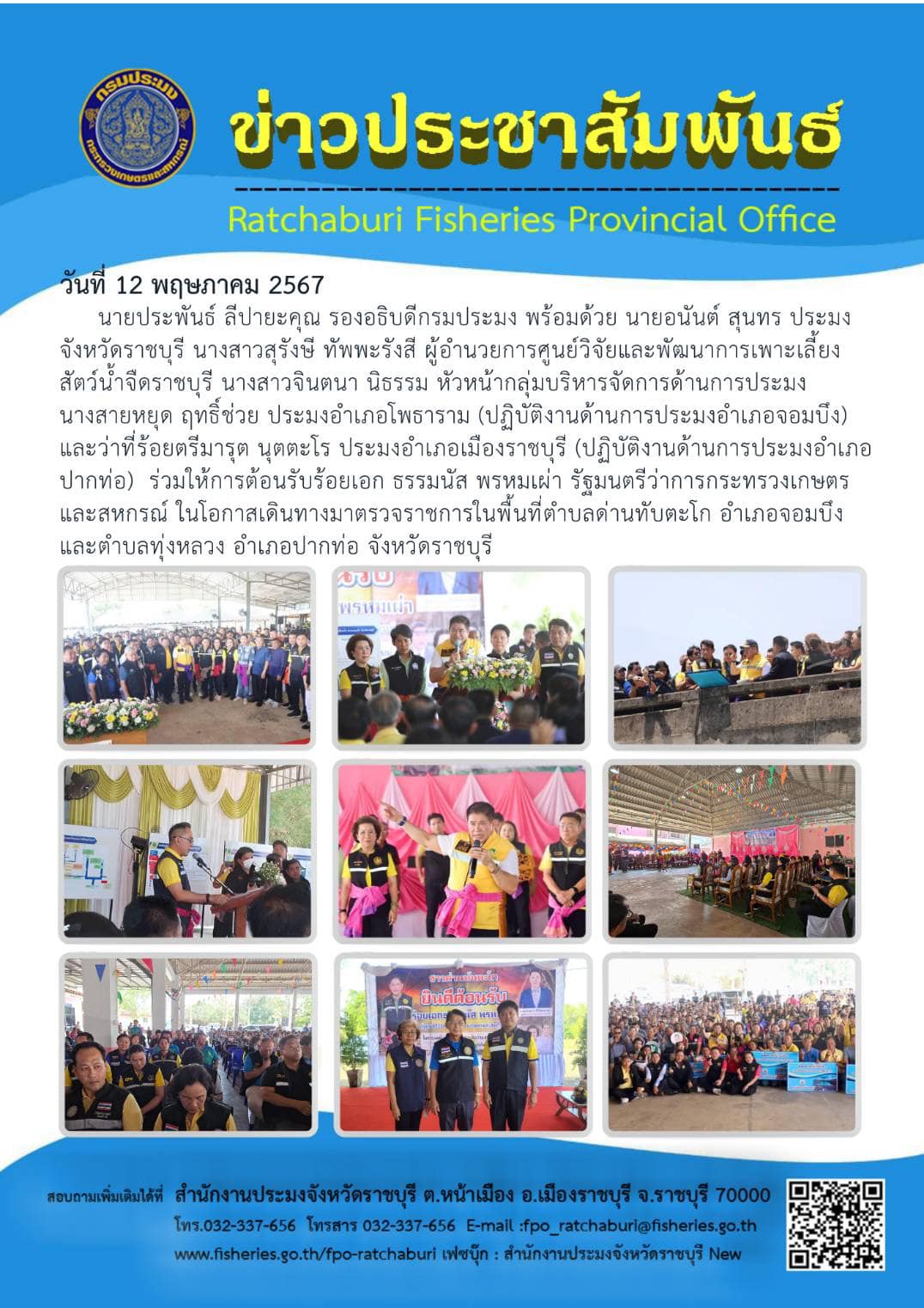 วันที่ 12 พฤษภาคม 2567 นายประพันธ์ ลีปายะคุณ รองอธิบดีกรมประมง พร้อมด้วย นายอนันต์ สุนทร ประมงจังหวัดราชบุรี นางสาวสุรังษี ทัพพะรังสี ผู้อำนวยการศูนย์วิจัยและพัฒนาการเพาะเลี้ยงสัตว์น้ำจืดราชบุรี นางสาวจินตนา นิธรรม หัวหน้ากลุ่มบริหารจัดการด้านการประมง นางสายหยุด ฤทธิ์ช่วย ประมงอำเภอโพธาราม (ปฏิบัติงานด้านการประมงอำเภอจอมบึง) และว่าที่ร้อยตรีมารุต นุตตะโร ประมงอำเภอเมืองราชบุรี (ปฏิบัติงานด้านการประมงอำเภอปากท่อ) ร่วมให้การต้อนรับ ร้อยเอก ธรรมนัส พรหมเผ่า รัฐมนตรีว่าการกระทรวงเกษตรและสหกรณ์ ในโอกาสเดินทางมาตรวจราชการในพื้นที่ตำบลด่านทับตะโก อำเภอจอมบึง และตำบลทุ่งหลวง อำเภอปากท่อ จังหวัดราชบุรี