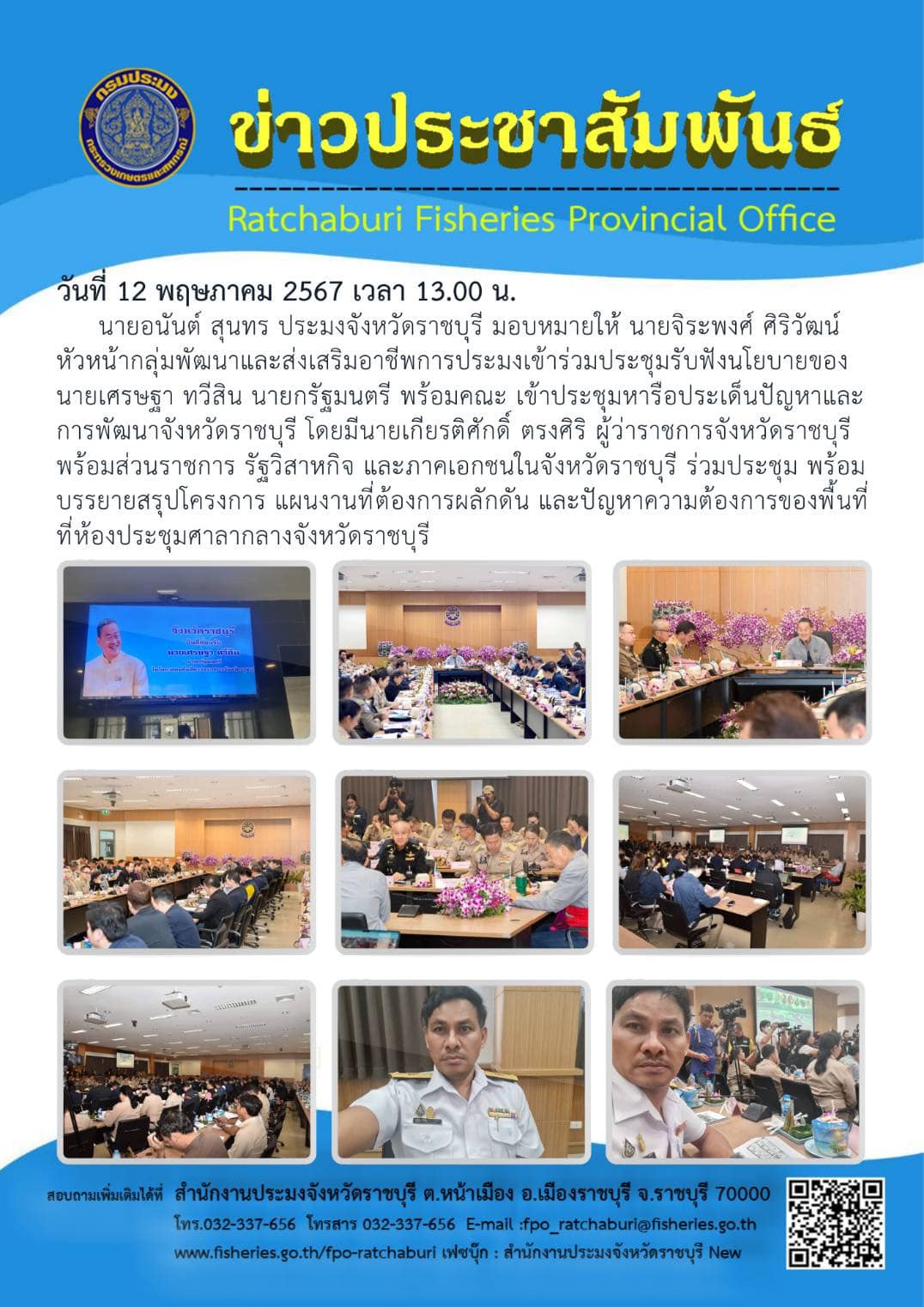 วันที่ 12 พฤษภาคม 2567 เวลา 13.30 น นายอนันต์ สุนทร ประมงจังหวัดราชบุรี มอบหมายให้ นายจิระพงศ์ ศิริวัฒน์ หัวหน้ากลุ่มพัฒนาและส่งเสริมอาชีพการประมง เข้าร่วมประชุมรับฟังนโยบายของ นายเศรษฐา ทวีสิน นายกรัฐมนตรี พร้อมคณะ เข้าประชุมหารือประเด็นปัญหาและการพัฒนาจังหวัดราชบุรี โดยมีนายเกียรติศักดิ์ ตรงศิริ ผู้ว่าราชการจังหวัดราชบุรี พร้อมส่วนราชการ รัฐวิสาหกิจ และภาคเอกชนในจังหวัดราชบุรี ร่วมประชุม พร้อมบรรยายสรุปโครงการ แผนงานที่ต้องการผลักดัน และปัญหาความต้องการของพื้นที่ ที่ห้องประชุมศาลากลางจังหวัดราชบุรี