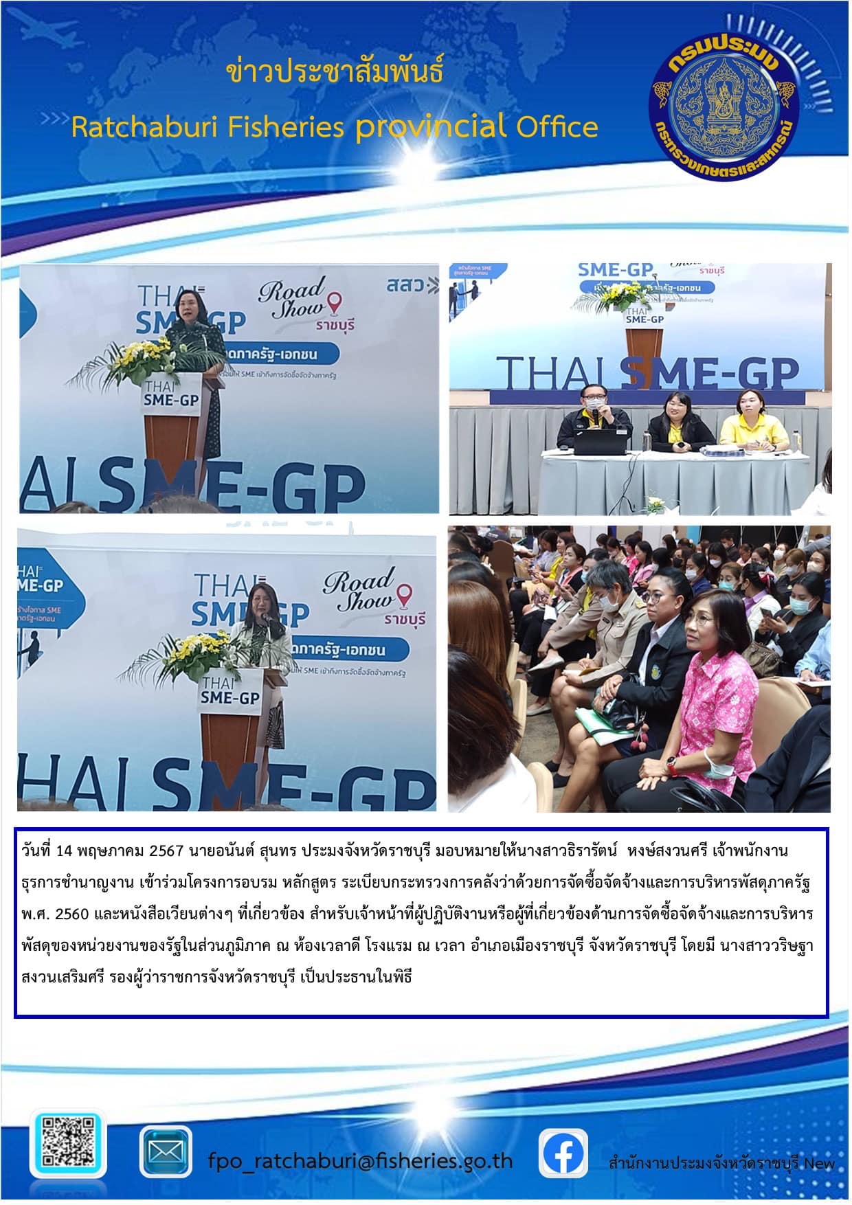 วันที่ 14 พฤษภาคม 2567 นายอนันต์ สุนทร ประมงจังหวัดราชบุรี มอบหมายให้นางสาวธิรารัตน์ หงษ์สงวนศรี เจ้าพนักงานธุรการชำนาญงาน เข้าร่วมโครงการอบรมหลักสูตรระเบียบกระทรวงการคลังว่าด้วยการจัดซื้อจัดจ้างและการบริหารพัสดุภาครัฐ พ.ศ. 2560 และหนังสือเวียนต่างๆ ที่เกี่ยวข้อง สำหรับเจ้าหน้าที่ผู้ปฏิบัติงานหรือผู้ที่เกี่ยวข้องด้านการจัดซื้อจัดจ้างและการบริหารพัสดุของหน่วยงานของรัฐในส่วนภูมิภาค ณ ห้องเวลาดี โรงแรม ณ เวลา อำเภอเมืองราชบุรี จังหวัดราชบุรี โดยมีนางสาววริษฐา สงวนเสริมศรี รองผู้ว่าราชการจังหวัดราชบุรี เป็นประธานในพิธี