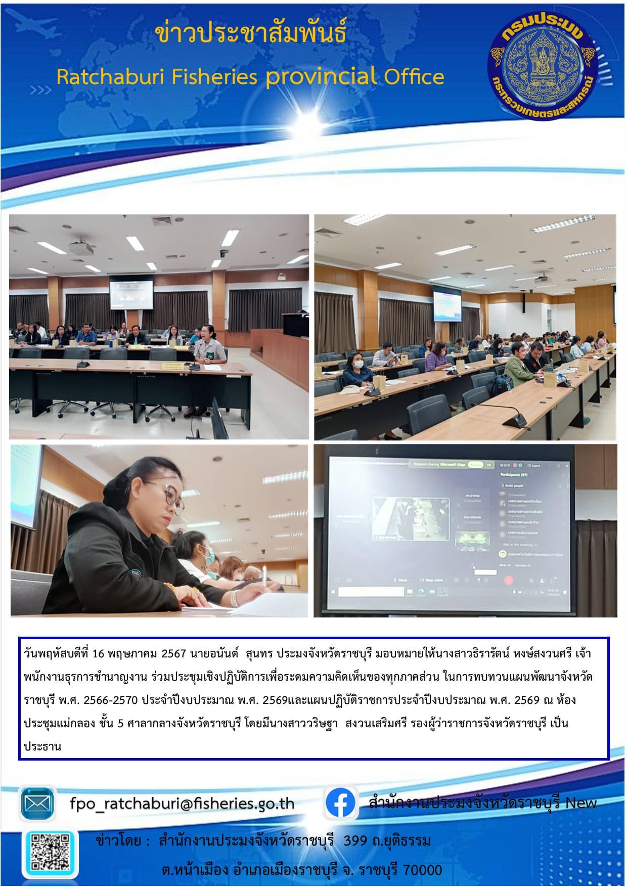 วันพฤหัสบดีที่ 16 พฤษภาคม 2567 นายอนันต์ สุนทร ประมงจังหวัดราชบุรี มอบหมายให้ นางสาวธิรารัตน์ หงษ์สงวนศรี เจ้าพนักงานธุรการชำนาญงาน ร่วมประชุมเชิงปฏิบัติการเพื่อระดมความคิดเห็นของทุกภาคส่วน ในการทบทวนแผนพัฒนาจังหวัดราชบุรี พ.ศ. 2566-2570 ประจำปีงบประมาณ พ.ศ. 2569 และแผนปฏิบัติราชการประจำปีงบประมาณ พ.ศ. 2569 ณ ห้องประชุมแม่กลอง ชั้น 5 ศาลากลางจังหวัดราชบุรี โดยมี นางสาววริษฐา สงวนเสริมศรี รองผู้ว่าราชการจังหวัดราชบุรี เป็นประธาน