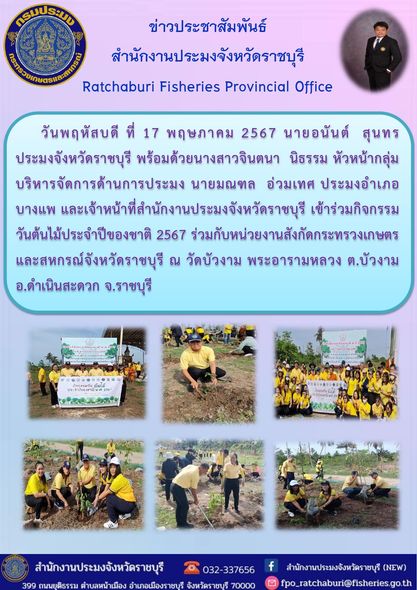 วันศุกร์ที่ 17 พฤษภาคม 2567 นายอนันต์ สุนทร ประมงจังหวัดราชบุรี พร้อมด้วย นางสาวจินตนา นิธรรม หัวหน้ากลุ่มบริหารจัดการด้านการประมง นายมณฑล อ่วมเทศ ประมงอำเภอบางแพ และเจ้าหน้าที่สำนักงานประมงจังหวัดราชบุรี เข้าร่วมกิจกรรมวันต้นไม้ประจำปีของชาติ 2567 ร่วมกับหน่วยงานสังกัดกระทรวงเกษตรและสหกรณ์จังหวัดราชบุรี ณ วัดบัวงาม พระอารามหลวง ตำบลบัวงาม อำเภอดำเนินสะดวก จังหวัดราชบุรี