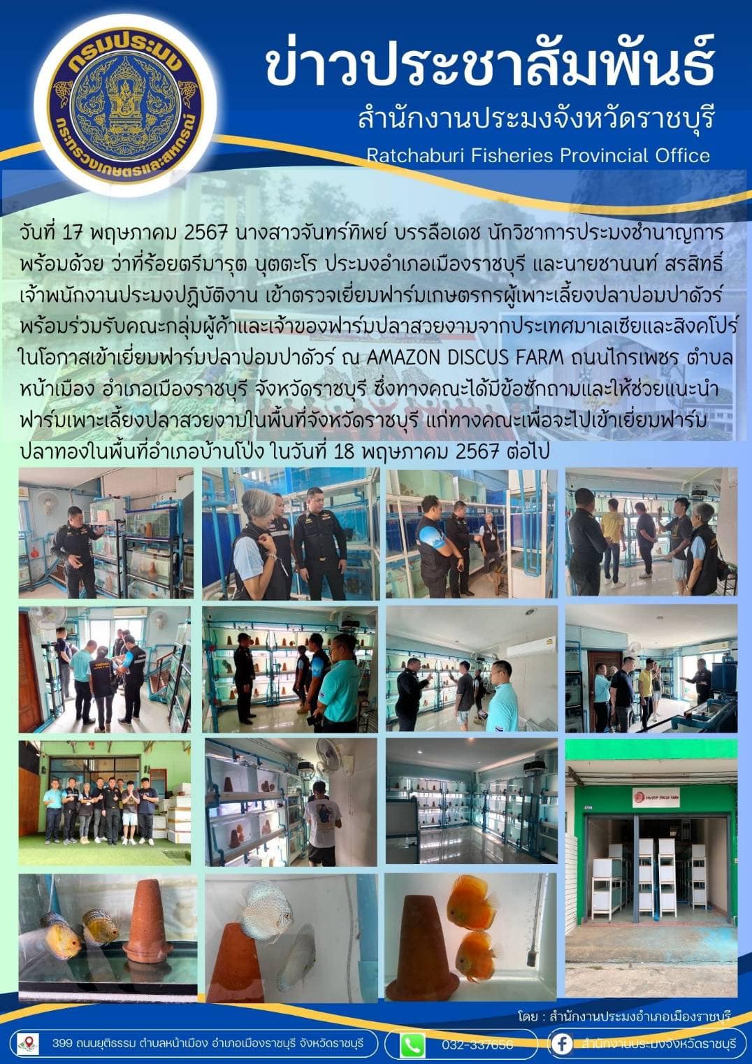 วันที่ 17 พฤษภาคม 2567 นางสาวจันทร์ทิพย์ บรรลือเดช นักวิชาการประมงชำนาญการ พร้อมด้วย ว่าที่ร้อยตรีมารุต นุตตะโร ประมงอำเภอเมืองราชบุรี และนายชานนท์ สรสิทธิ์ เจ้าพนักงานประมง เข้าตรวจเยี่ยมฟาร์มเกษตรกรผู้เพาะเลี้ยง ปลาปอมปาดัวร์ พร้อมร่วมรับคณะกลุ่มผู้ค้าและเจ้าของฟาร์มปลาสวยงามจากประเทศมาเลเซียและสิงคโปร์ ในโอกาสเข้าเยี่ยมฟาร์มปลาปอมปาดัวร์ ณ AMAZON DISCUS FARM ถนนไกรเพชร ตำบลหน้าเมือง อำเภอเมืองราชบุรี จังหวัดราชบุรี ซึ่งทางคณะได้มีข้อซักถามและให้ช่วยแนะนำฟาร์มเพาะเลี้ยง ปลาสวย งามในพื้นที่จังหวัดราชบุรี แก่ทางคณะเพื่อจะไปเข้าเยี่ยมฟาร์ม ปลาทองในพื้นที่อำเภอบ้านโป่ง ในวันที่ 18 พฤษภาคม 2567 ต่อไป
