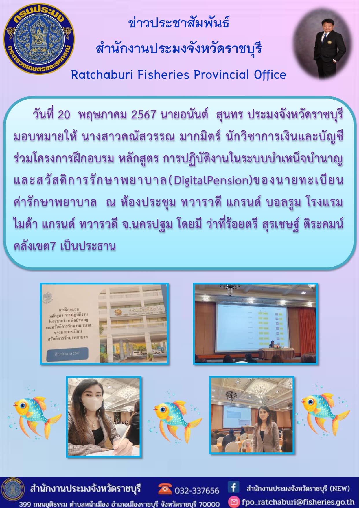 วันที่ 20 พฤษภาคม 2567 นายอนันต์ สุนทร ประมงจังหวัดราชบุรี มอบหมายให้ นางสาวคณัสวรรณ มากมิตร์ นักวิชาการเงินและบัญชี ร่วมโครงการฝึกอบรม หลักสูตร การปฏิบัติงานในระบบบำเหน็จบำนาญและสวัสดิการรักษาพยาบาล (DigitalPension) ของนายทะเบียนค่ารักษาพยาบาล ณ ห้องประชุม ทวารวดี แกรนด์ บอลรูม โรงแรม ไมด้า แกรนด์ ทวารวดี จ.นครปฐม โดยมี ว่าที่ร้อยตรี สุรเชษฐ์ ติระคมน์ คลังเขต 7 เป็นประธาน