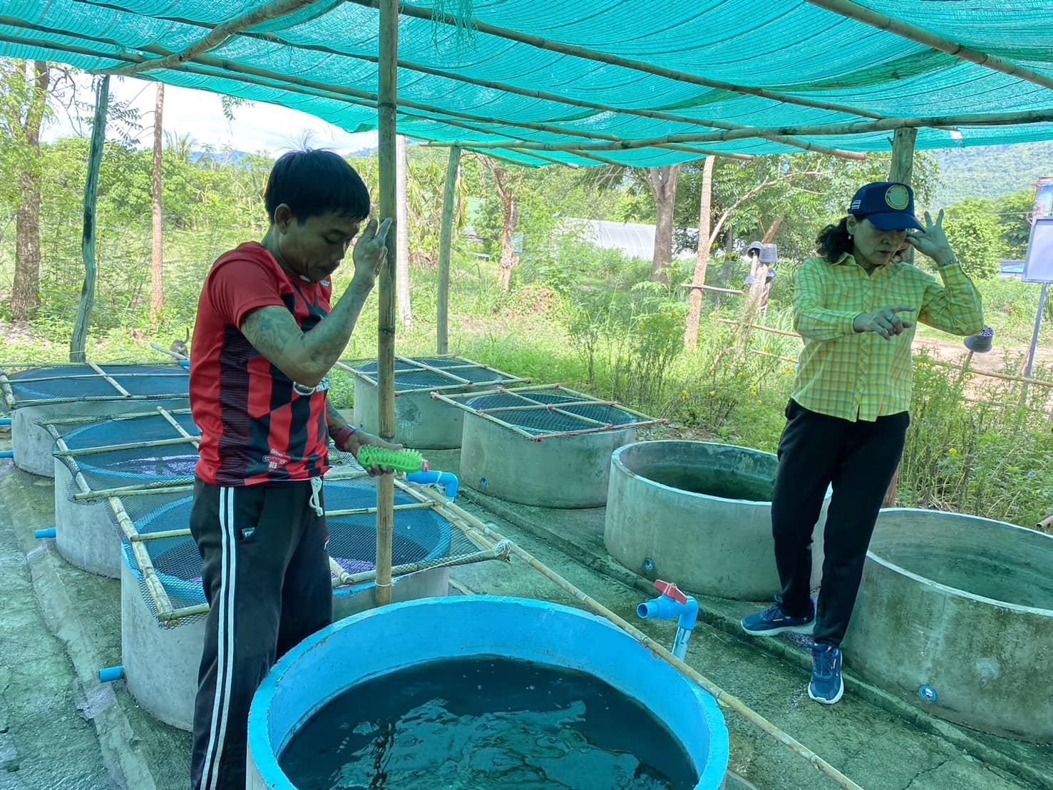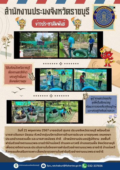 วันที่ 21 พฤษภาคม 2567 นายอนันต์ สุนทร ประมงจังหวัดราชบุรี พร้อมด้วย นางสาวจินตนา นิธรรม หัวหน้ากลุ่มบริหารจัดการด้านการประมง นางอุทุมพร เหมหงษา ประมงอำเภอสวนผึ้งและนางสาวธนัชพร คำดี เจ้าพนักงานประมงปฏิบัติงาน ลงพื้นที่ฟาร์มตัวอย่างตามแนวพระราชดำริบ้านบ่อหวี ตำบลตะนาวศรี อำเภอสวนผึ้ง จังหวัดราชบุรี เพื่อตรวจติดตามและประเมินงานในโครงการฟาร์มตัวอย่างตามแนวพระราชดำริ บ้านบ่อหวี กิจกรรมส่งเสริมการเพาะเลี้ยงปลาสวยงามในฟาร์มตัวอย่างตามแนวพระราชดำริ