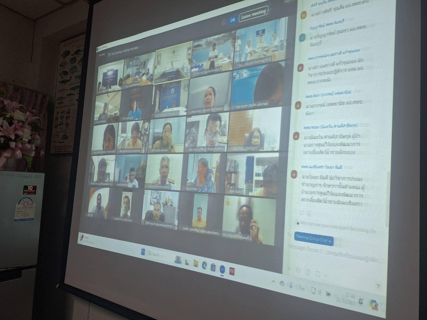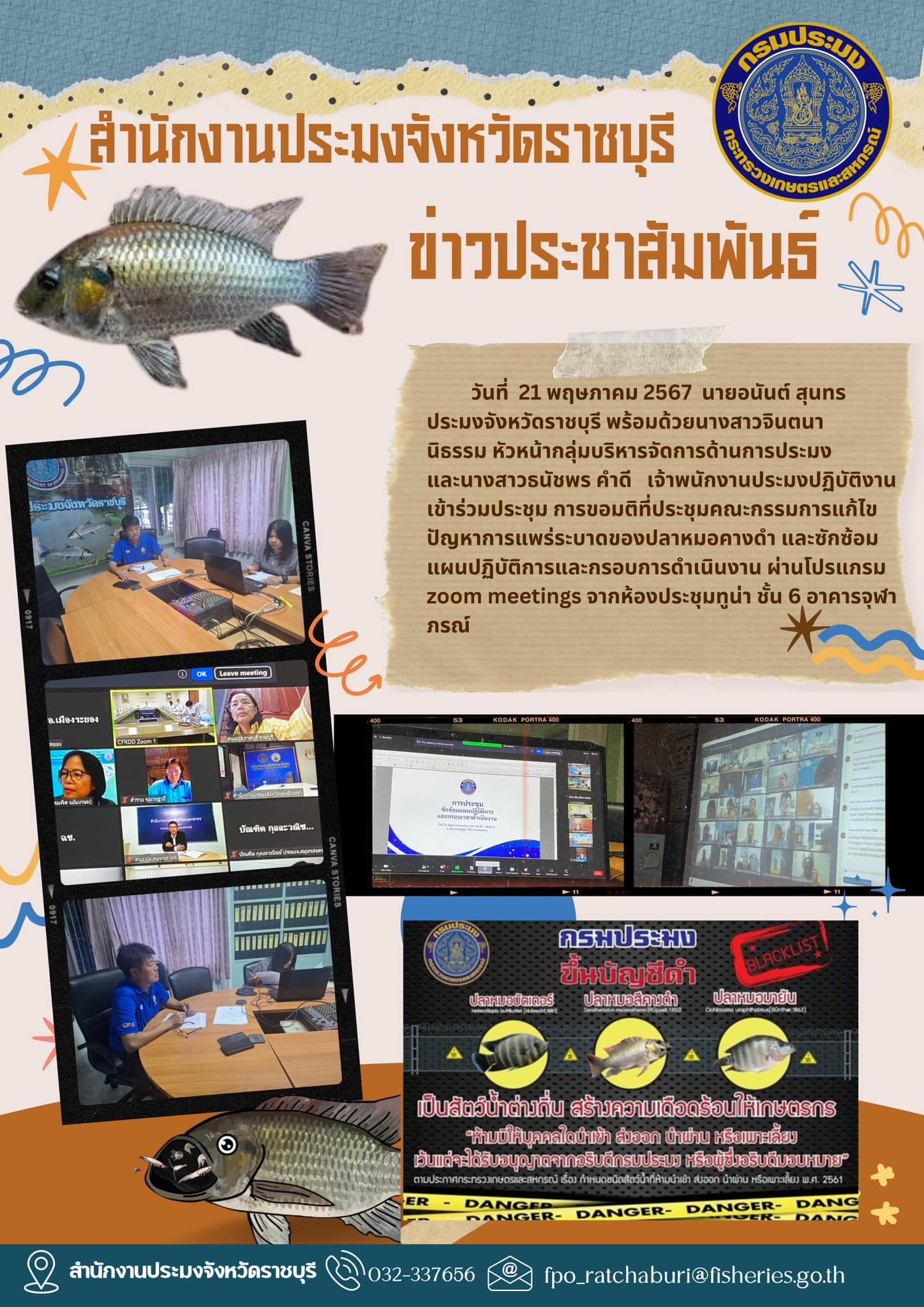 วันที่ 21 พฤษภาคม 2567 นายอนันต์ สุนทร ประมงจังหวัดราชบุรี พร้อมด้วย นางสาวจินตนา นิธรรม หัวหน้ากลุ่มบริหารจัดการด้านการประมง และนางสาวธนัชพร คำดี เจ้าพนักงานประมงปฏิบัติงาน เข้าร่วมประชุมการขอมติที่ประชุมคณะกรรมการแก้ไขปัญหาการแพร่ระบาดของปลาหมอคางดำ และซักซ้อมแผนปฏิบัติการและกรอบการดำเนินงาน ผ่านโปรแกรม zoom meetings จากห้องประชุมทูน่า ชั้น 6 อาคารจุฬาภรณ์ กรมประมง