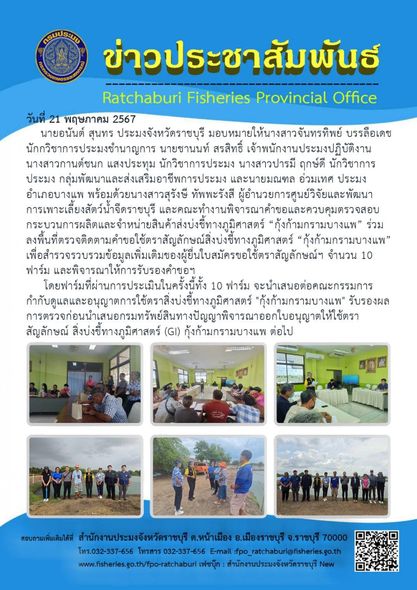 วันอังคารที่ 21 พฤษภาคม 2567 นายอนันต์ สุนทร ประมงจังหวัดราชบุรี มอบหมายให้ นางสาวจันทร์ทิพย์ บรรลือเดช นักวิชาการประมงชำนาญการ นายชานนท์ สรสิทธิ์ เจ้าพนักงานประมงปฏิบัติงาน นางสาวกานต์ชนก แสงประทุม นักวิชาการประมง นางสาวปารมี ฤกษ์ดี นักวิชาการประมง กลุ่มพัฒนาและส่งเสริมอาชีพการประมง และ นายมณฑล อ่วมเทศ ประมงอำเภอบางแพ พร้อมด้วย นางสาวสุรังษี ทัพพะรังสี ผู้อำนวยการศูนย์วิจัยและพัฒนาการเพาะเลี้ยงสัตว์น้ำจืดราชบุรี และคณะทำงานพิจารณาคำขอและควบคุมตรวจสอบกระบวนการผลิตและจำหน่ายสินค้าส่งบ่งชี้ทางภูมิศาสตร์ “กุ้งก้ามกรามบางแพ” ร่วมลงพื้นที่ตรวจติดตามคำขอใช้ตราสัญลักษณ์สิ่งบ่งชี้ทางภูมิศาสตร์ “กุ้งก้ามกรามบางแพ” เพื่อสำรวจรวบรวมข้อมูลเพิ่มเติมของผู้ยื่นใบสมัครขอใช้ตราสัญลักษณ์ฯ จำนวน 10 ฟาร์ม และพิจารณาให้การรับรองคำขอฯ โดยฟาร์มที่ผ่านการประเมินในครั้งนี้ทั้ง 10 ฟาร์ม จะนำเสนอต่อคณะกรรมการกำกับดูแลและอนุญาตการใช้ตราสิ่งบ่งชี้ทางภูมิศาสตร์ "กุ้งก้ามกรามบางแพ" รับรองผลการตรวจก่อนนำเสนอกรมทรัพย์สินทางปัญญาพิจารณาออกใบอนุญาตให้ใช้ตราสัญลักษณ์ สิ่งบ่งชี้ทางภูมิศาสตร์ (GI) กุ้งก้ามกรามบางแพ ต่อไป