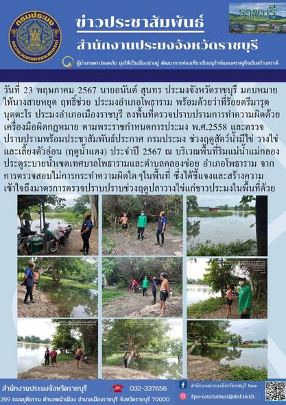 วันที่ 23 พฤษภาคม 2567 นายอนันต์ สุนทร ประมงจังหวัดราชบุรี มอบหมายให้ นางสายหยุด ฤทธิ์ช่วย ประมงอำเภอโพธาราม พร้อมด้วย ว่าที่ร้อยตรีมารุต นุตตะโร ประมงอำเภอเมืองราชบุรี ลงพื้นที่ตรวจปราบปรามการทำความผิดด้วยเครื่องมือผิดกฎหมาย ตามพระราชกำหนดการประมง พ.ศ.2558 และตรวจปราบปรามพร้อมประชาสัมพันธ์ประกาศ กรมประมง ช่วงฤดูสัตว์น้ำมีไข่ วางไข่ และเลี้ยงตัวอ่อน (ฤดูน้ำแดง) ประจำปี 2567 ณ บริเวณพื้นที่ริมแม่น้ำแม่กลอง ประตูระบายน้ำเขตเทศบาลโพธารามและตำบลคลองข่อย อำเภอโพธาราม จากการตรวจสอบไม่การกระทำความผิดใดๆในพื้นที่ ซึ่งได้ชี้แจงและสร้างความเข้าใจถึงมาตรการตรวจปราบปราบช่วงฤดูปลาวางไข่แก่ชาวประมงในพื้นที่ด้วย