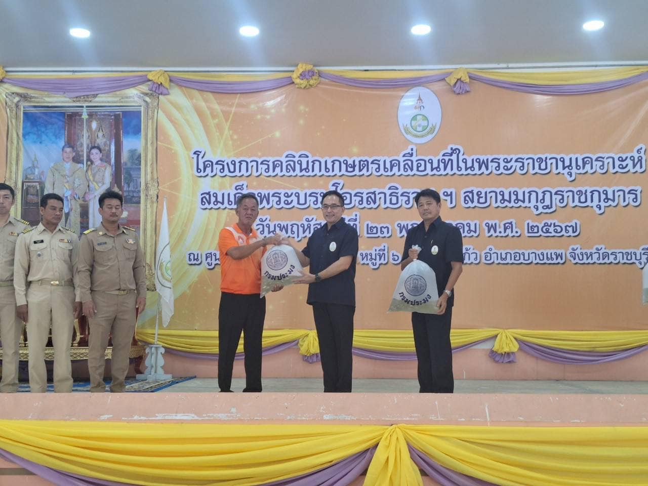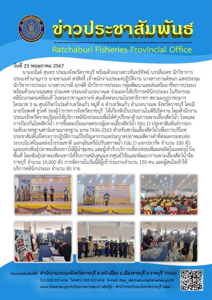 วันพฤหัสบดีที่ 23 พฤษภาคม 2567 นายอนันต์ สุนทร ประมงจังหวัดราชบุรี พร้อมด้วย นางสาวจันทร์ทิพย์ บรรลือเดช นักวิชาการประมงชำนาญการ นายชานนท์ สรสิทธิ์ เจ้าพนักงานประมงปฏิบัติงาน นางสาวกานต์ชนก แสงประทุม นักวิชาการประมง นางสาวปารมี ฤกษ์ดี นักวิชาการประมง กลุ่มพัฒนาและส่งเสริมอาชีพการประมง พร้อมด้วยนายมณฑล อ่วมเทศ ประมงอำเภอบางแพ ร่วมออกให้บริการคลินิกประมง ในกิจกรรมคลินิกเกษตรเคลื่อนที่ ในพระราชานุเคราะห์ สมเด็จพระบรมโอรสาธิราชฯ สยามมกุฎราชกุมาร ไตรมาส 3 ณ ศูนย์กีฬาในร่มตำบลวัดแก้ว หมู่ที่ 6 ตำบลวัดแก้ว อำเภอบางแพ จังหวัดราชบุรี โดยมี นายปิยพงศ์ ชูวงศ์ รองผู้ว่าราชการจังหวัดราชบุรี ให้เกียรติเป็นประธานในพิธีเปิดงาน โดยสำนักงานประมงจังหวัดราชบุรีออกให้บริการคลินิกประมงเพื่อให้คำปรึกษาด้านการเพาะเลี้ยงสัตว์น้ำ โรคและการป้องกันโรคสัตว์น้ำ การขึ้นทะเบียนเกษตรกรผู้เพาะเลี้ยงสัตว์น้ำ (ทบ.1) ประชาสัมพันธ์การยกระดับมาตรฐานฟาร์มตามมาตรฐาน มกษ.7436-2563 สำหรับฟาร์มเลี้ยงสัตว์น้ำเพื่อการบริโภค ประชาสัมพันธ์โครงการปฏิบัติการแก้ไขปัญหาการแพร่ระบาดปลาหมอสีคางดำที่ส่งผลกระทบต่อระบบนิเวศในแหล่งน้ำธรรมชาติ แจกจุลินทรีย์ปรับสภาพน้ำ (ปม.1) แจกปลากัด จำนวน 100 ตัว และมอบพันธุ์ปลาตะเพียนขาวให้ผู้นำชุมชน และผู้เข้ารับบริการเพื่อปล่อยเพิ่มผลผลิตในแหล่งน้ำในพื้นที่ โดยพันธุ์ปลาตะเพียนขาวได้รับการสนับสนุนจากศูนย์วิจัยและพัฒนาการเพาะเลี้ยงสัตว์น้ำจืดราชบุรี จำนวน 10,000 ตัว การจัดงานในวันนี้มีผู้เข้าร่วมงานจำนวน 150 คน และผู้สนใจเข้าใช้บริการคลินิกประมง จำนวน 80 ราย