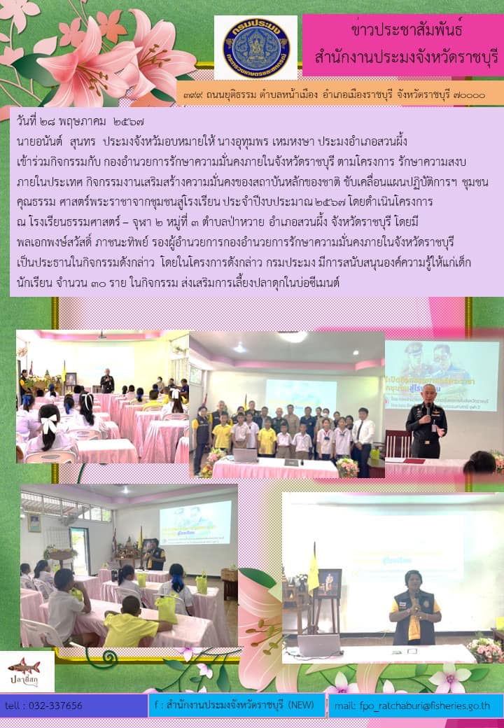 วันที่ 28 พฤษภาคม 2567 นายอนันต์ สุนทร ประมงจังหวัดราชบุรี มอบหมายให้ นางอุทุมพร เหมหงษา ประมงอำเภอสวนผึ้ง เข้าร่วมกิจกรรมกับกองอำนวยการรักษาความมั่นคงภายในจังหวัดราชบุรีตามโครงการรักษาความสงบภายในประเทศกิจกรรมงานเสริมสร้างความมั่นคงของสถาบันหลักของชาติ ขับเคลื่อนแผนปฏิบัติการฯ ชุมชนคุณธรรม ศาสตร์พระราชาจากชุมชนสู่โรงเรียน ประจำปีงบประมาณ 2567 โดยดำเนินโครงการ ณ โรงเรียนธรรมศาสตร์ – จุฬา 2 หมู่ที่ 3 ตำบลป่าหวาย อำเภอสวนผึ้ง จังหวัดราชบุรี โดยมีพลเอกพงษ์สวัสดิ์ ภาชนะทิพย์รองผู้อำนวยการกองอำนวยการรักษาความมั่นคงภายในจังหวัดราชบุรี เป็นประธานในกิจกรรมดังกล่าว โดยในโครงการดังกล่าว กรมประมง มีการสนับสนุนองค์ความรู้ให้แก่เด็กนักเรียน จำนวน 30 ราย ในกิจกรรม ส่งเสริมการเลี้ยงปลาดุกในบ่อซีเมนต์