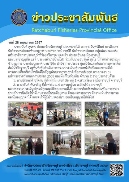 วันที่ 28 พฤษภาคม 2567 นายอนันต์ สุนทร ประมงจังหวัดราชบุรี มอบหมายให้ นางสาวจันทร์ทิพย์ บรรลือเดช นักวิชาการประมงชำนาญการ นางสาวปารมี ฤกษ์ดี นักวิชาการประมง กลุ่มพัฒนาและส่งเสริมอาชีพการประมง ว่าที่ร้อยตรีมารุต นุตตะโร ประมงอำเภอเมืองราชบุรี และนางขวัญฤทัย แซ่ลี้ ประมงอำเภอบ้านโป่ง ร่วมกับนายอนุรักษ์ สุขโข นักวิชาการประมงชำนาญการ นายพัฒนะพงศ์ นานาวิชิต นักวิชาการประมง ศูนย์วิจัยและพัฒนาการเพาะเลี้ยงสัตว์น้ำจืดราชบุรี ลงพื้นที่เพื่อดำเนินการตรวจประเมินเพื่อขอหนังสือรับรองสถานที่ทำการเพาะเลี้ยงสัตว์น้ำชนิดที่ใกล้สูญพันธุ์จากธรรมชาติเพื่อการส่งออก ตามมาตรา 65 แห่งพระราชกำหนดการประมง 2558 และที่แก้ไขเพิ่มเติม จำนวน 2 ราย ประกอบด้วย